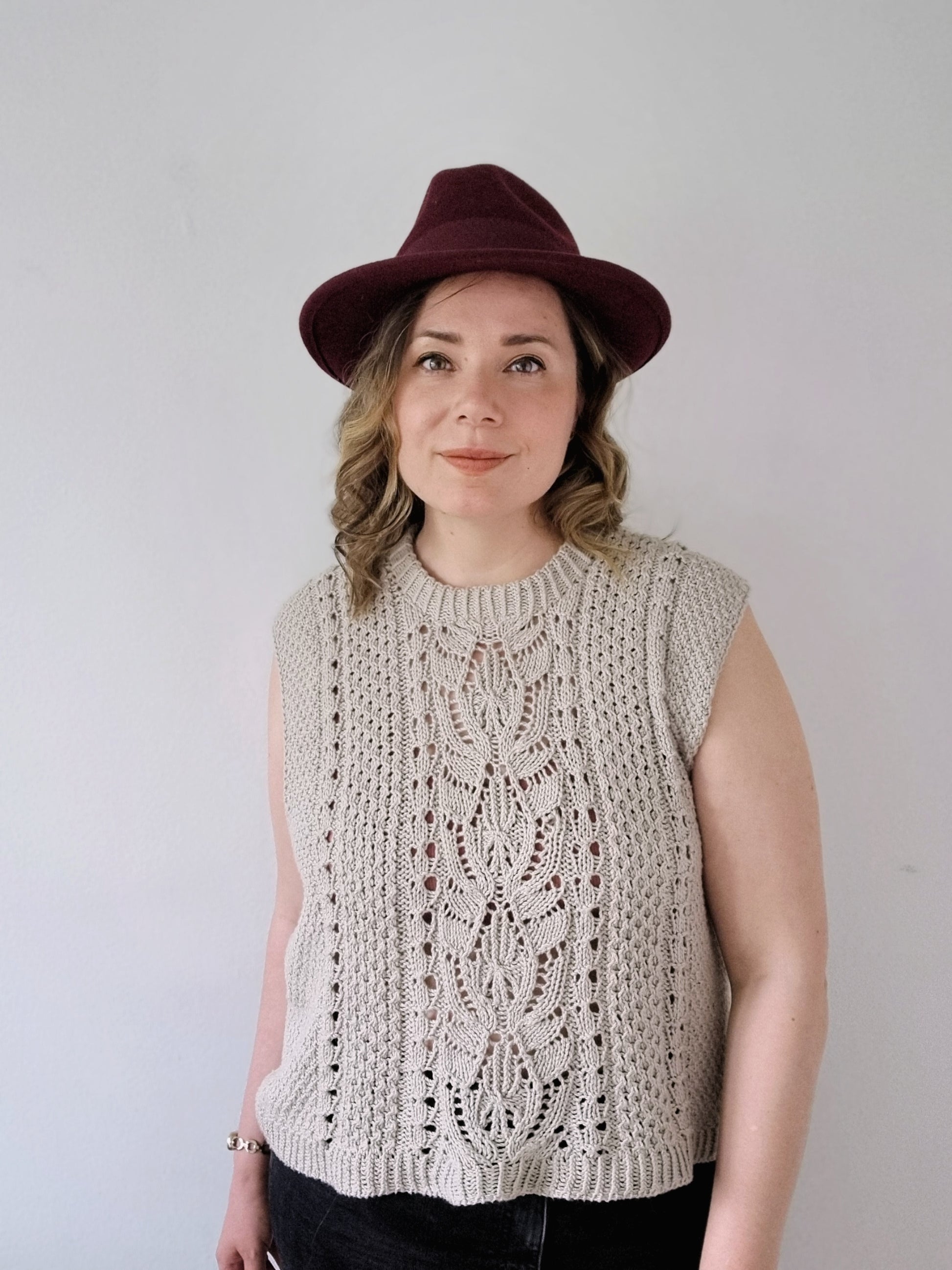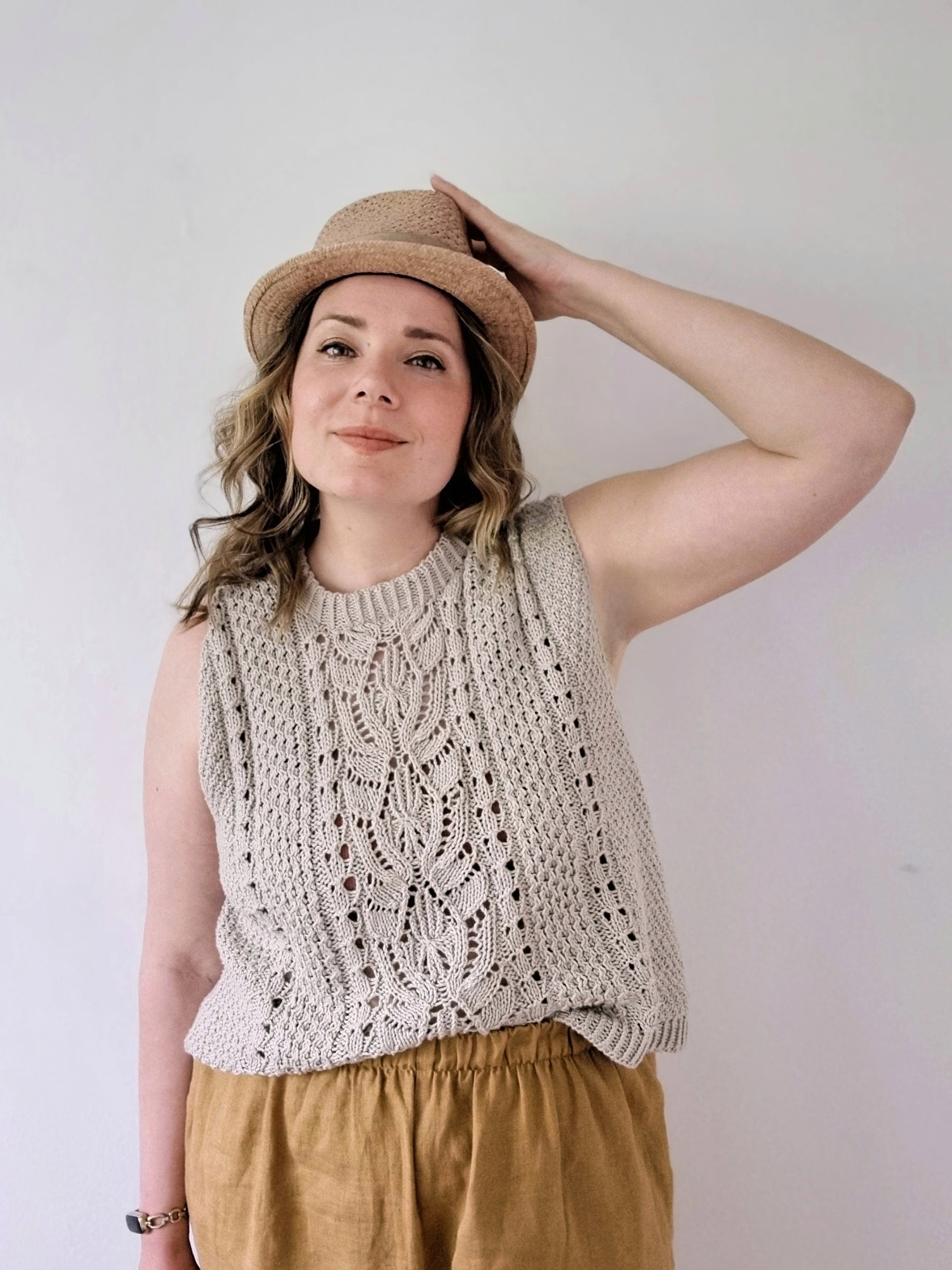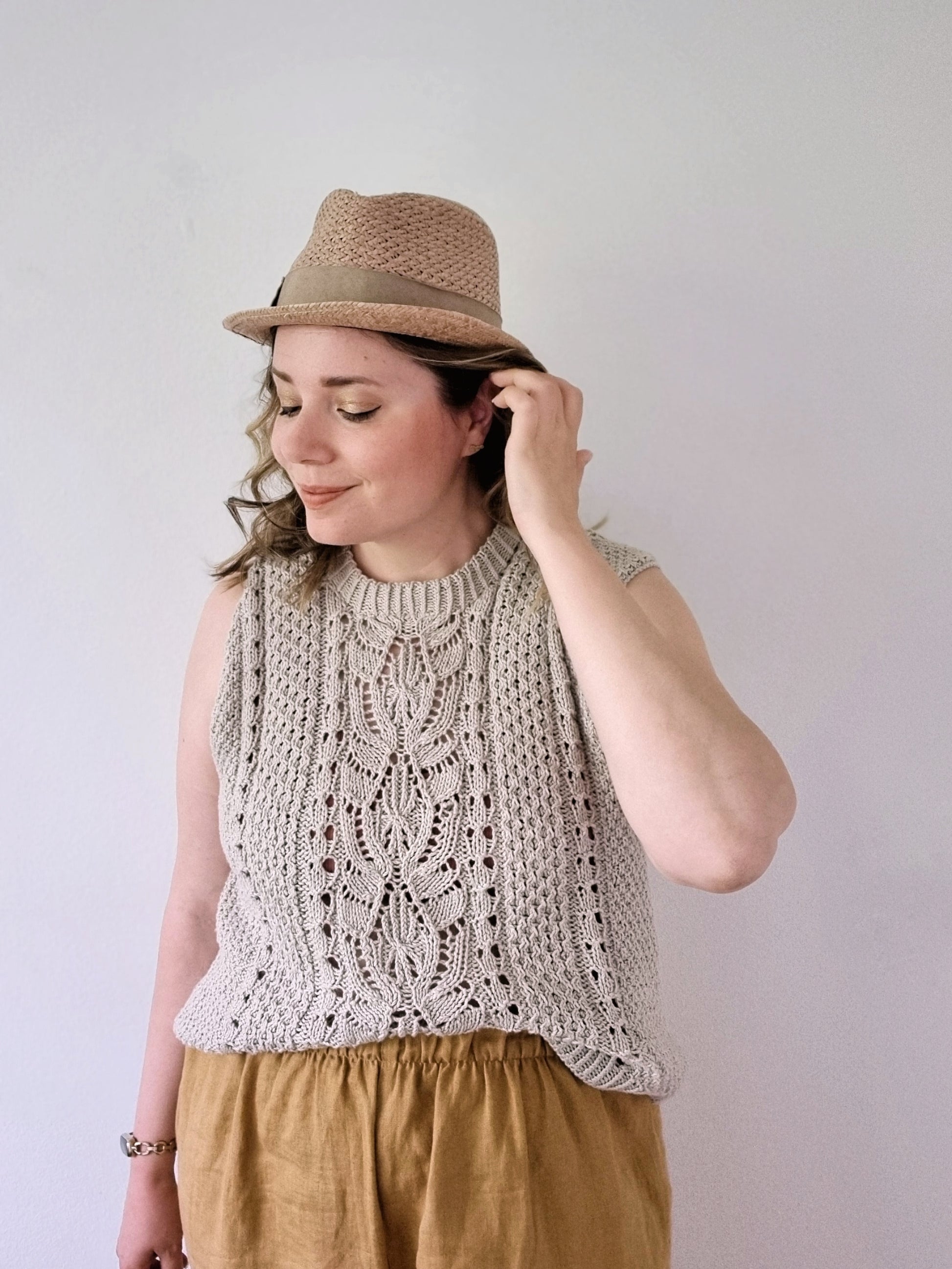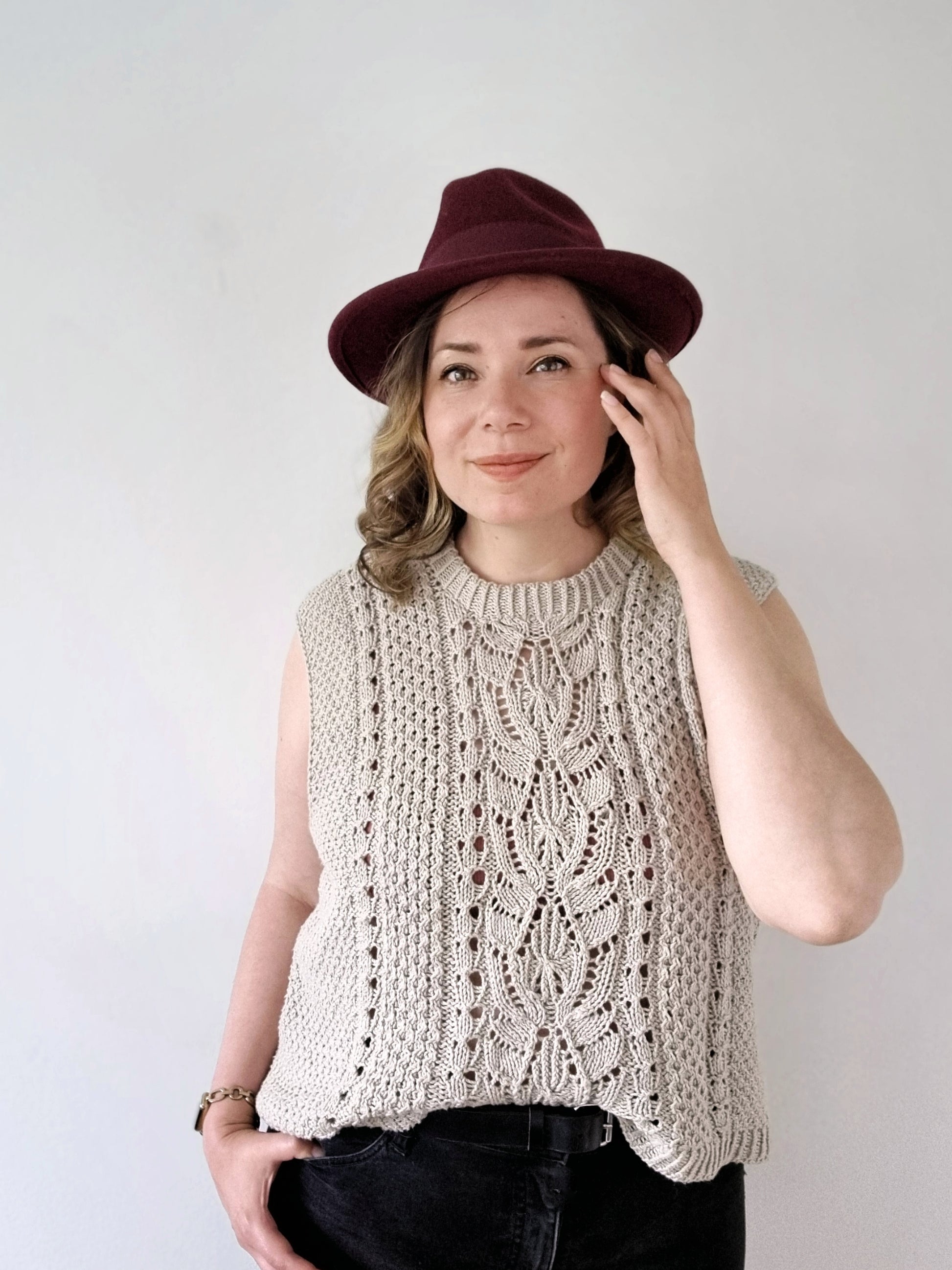 The Rosenlund top can be worn either as a sleeveless summer top or a vest. For a summer version I would recommend a cotton, viscose or linen blend. For a warmer, wintery version choose yarn with high wool content.