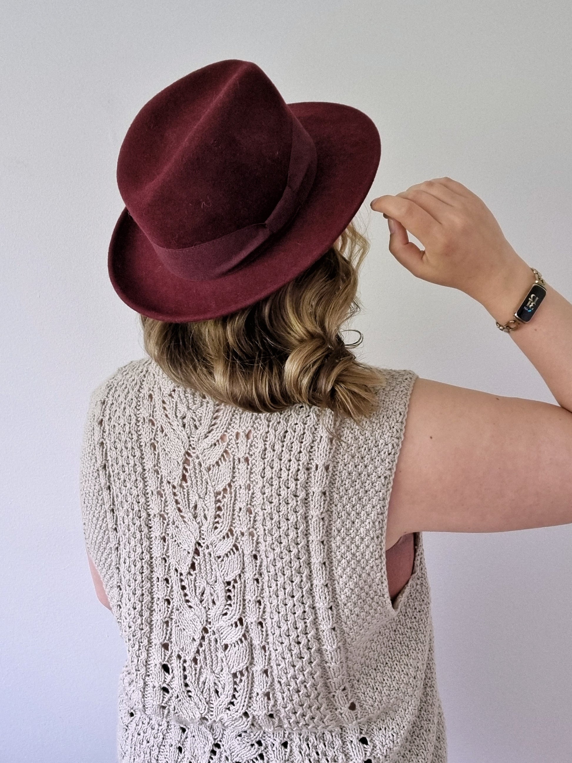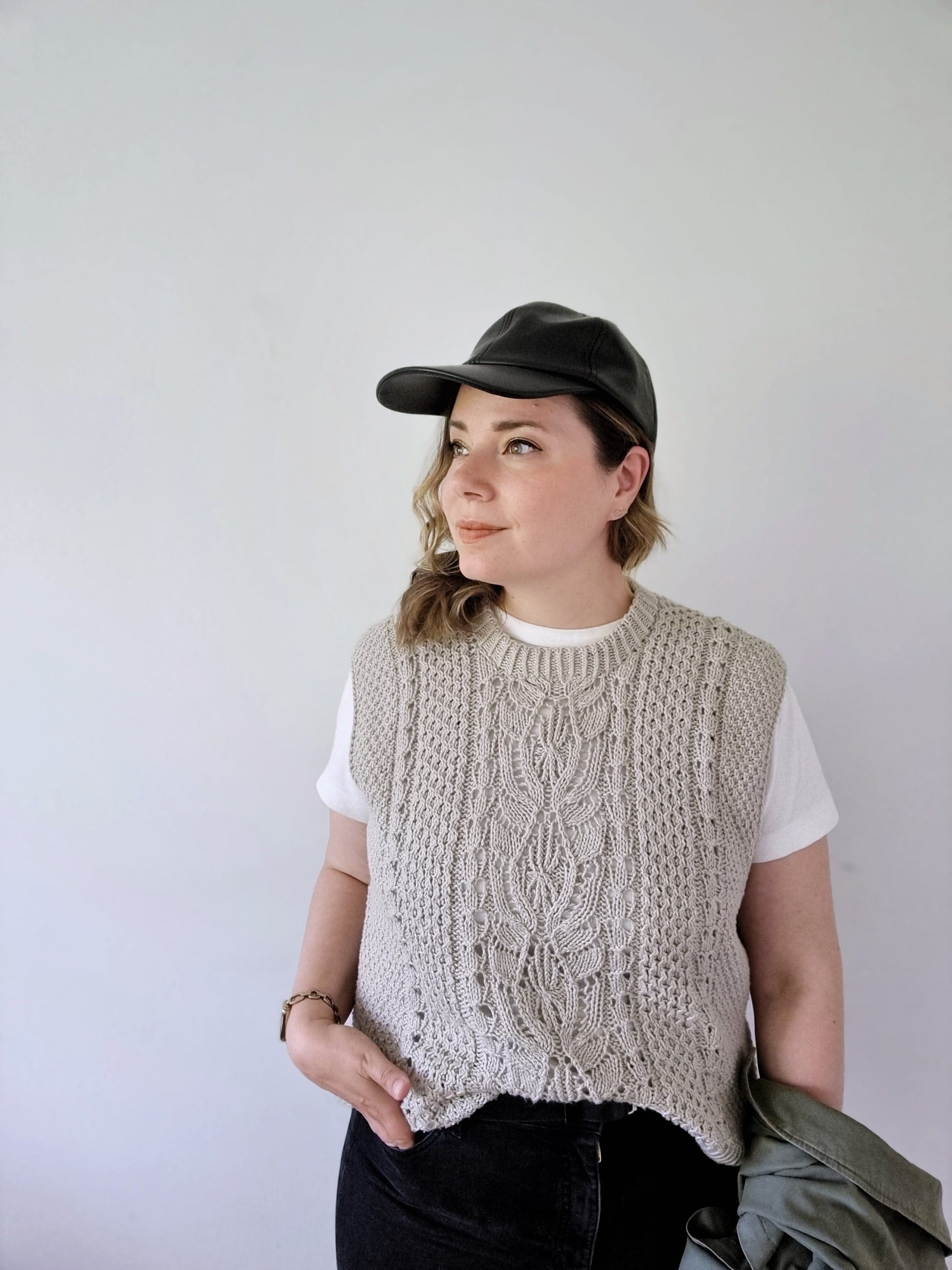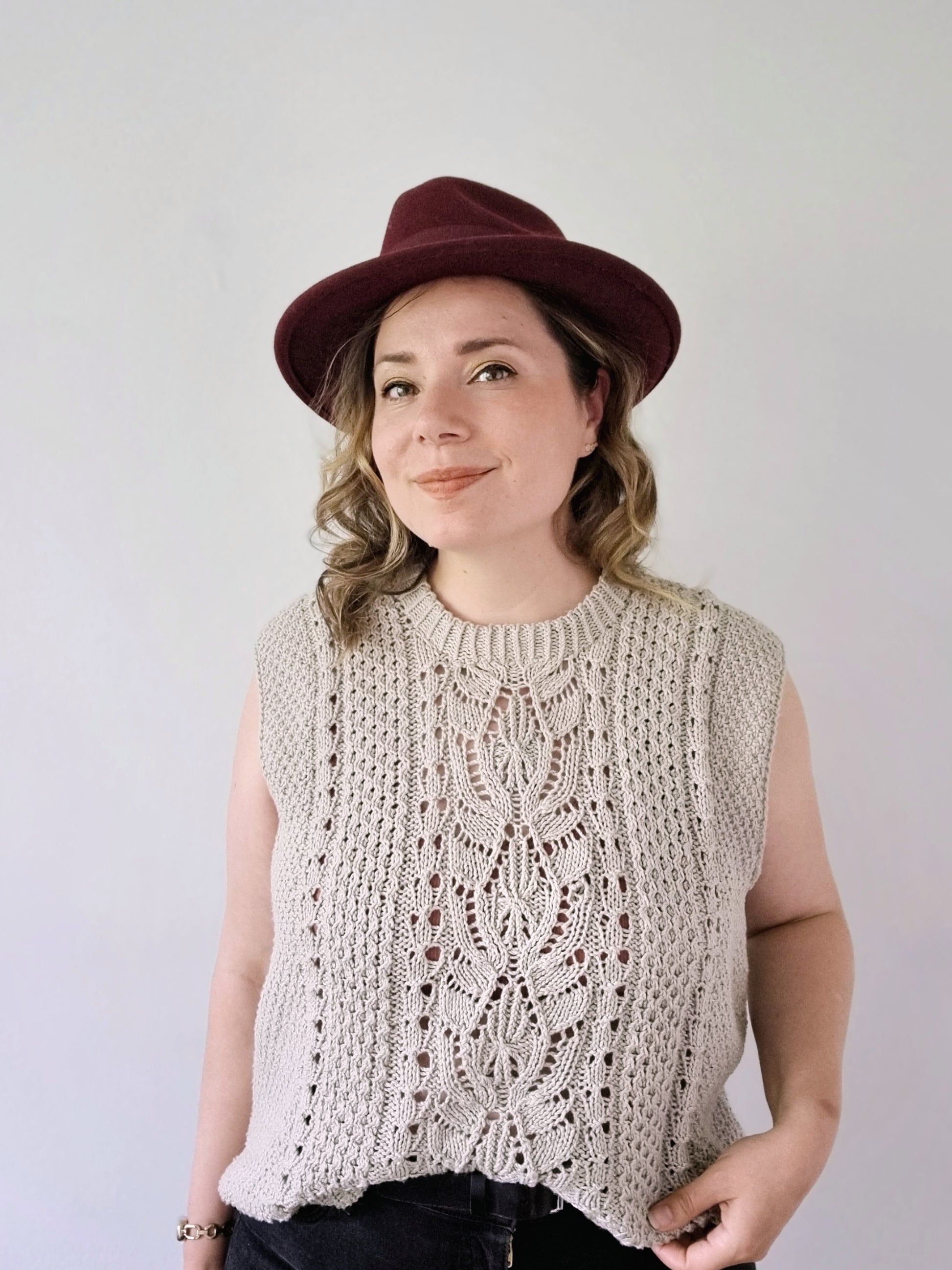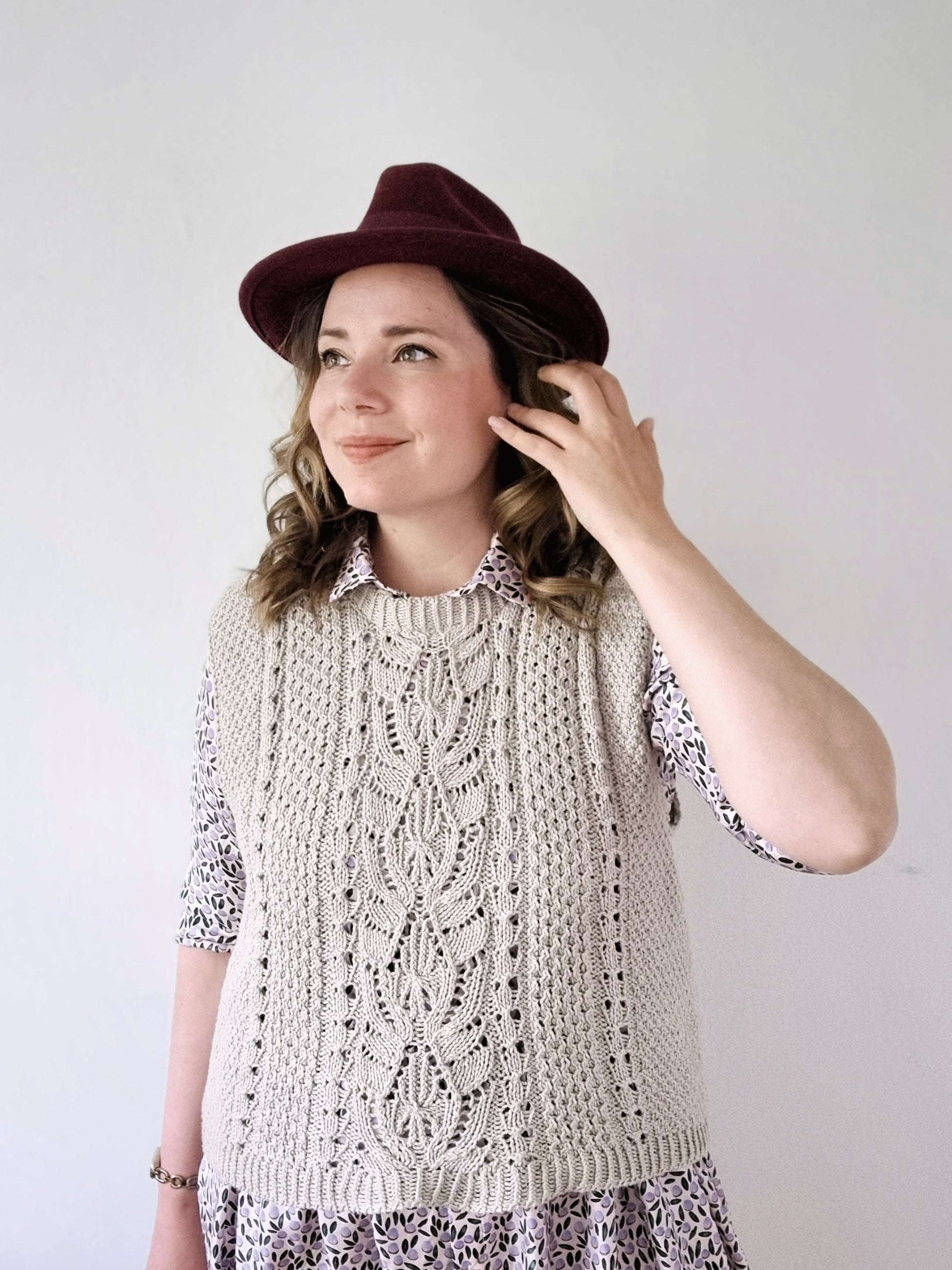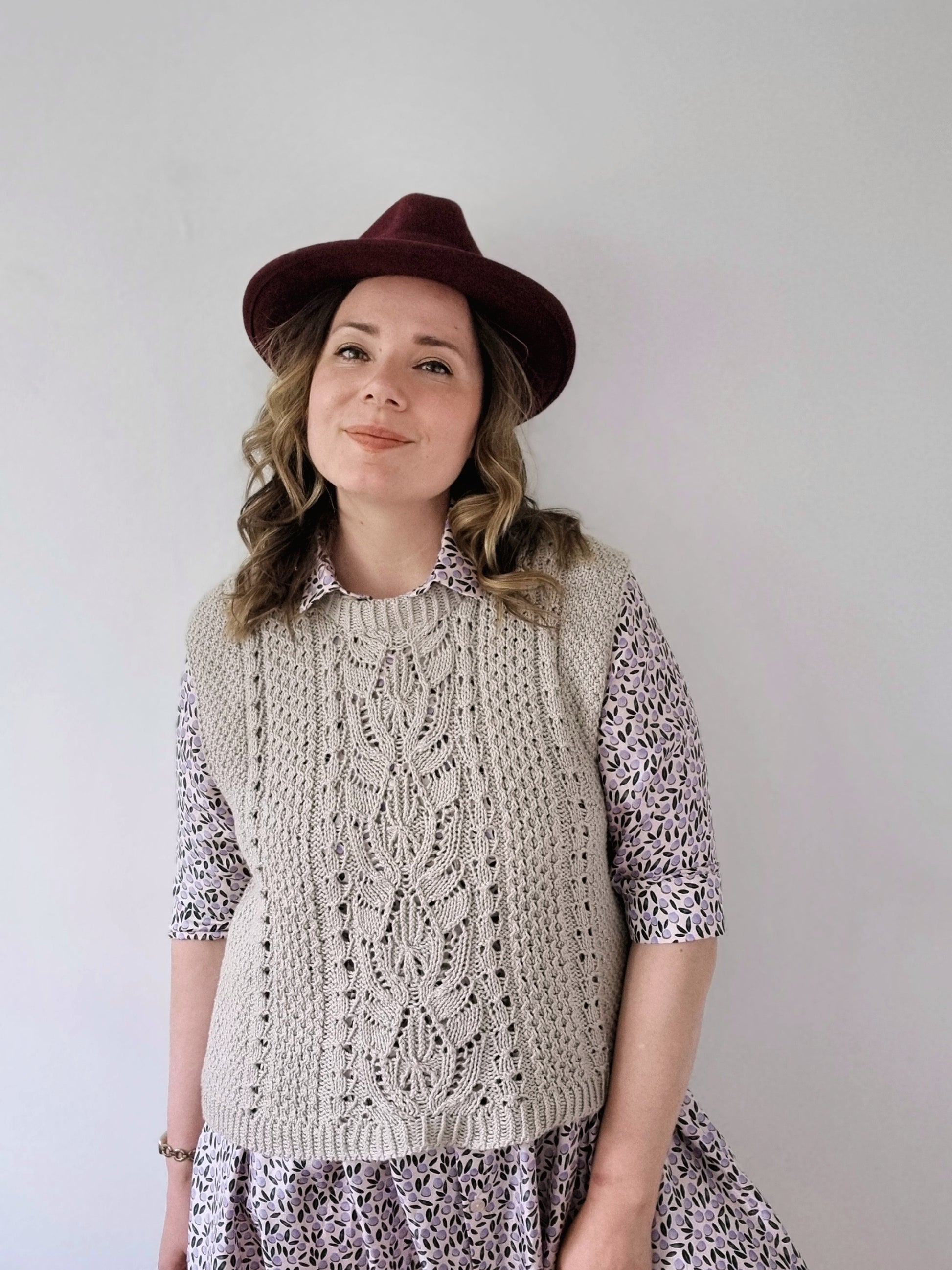 The Rosenlund top can be worn either as a sleeveless summer top or a vest. For a summer version I would recommend a cotton, viscose or linen blend. For a warmer, wintery version choose yarn with high wool content.