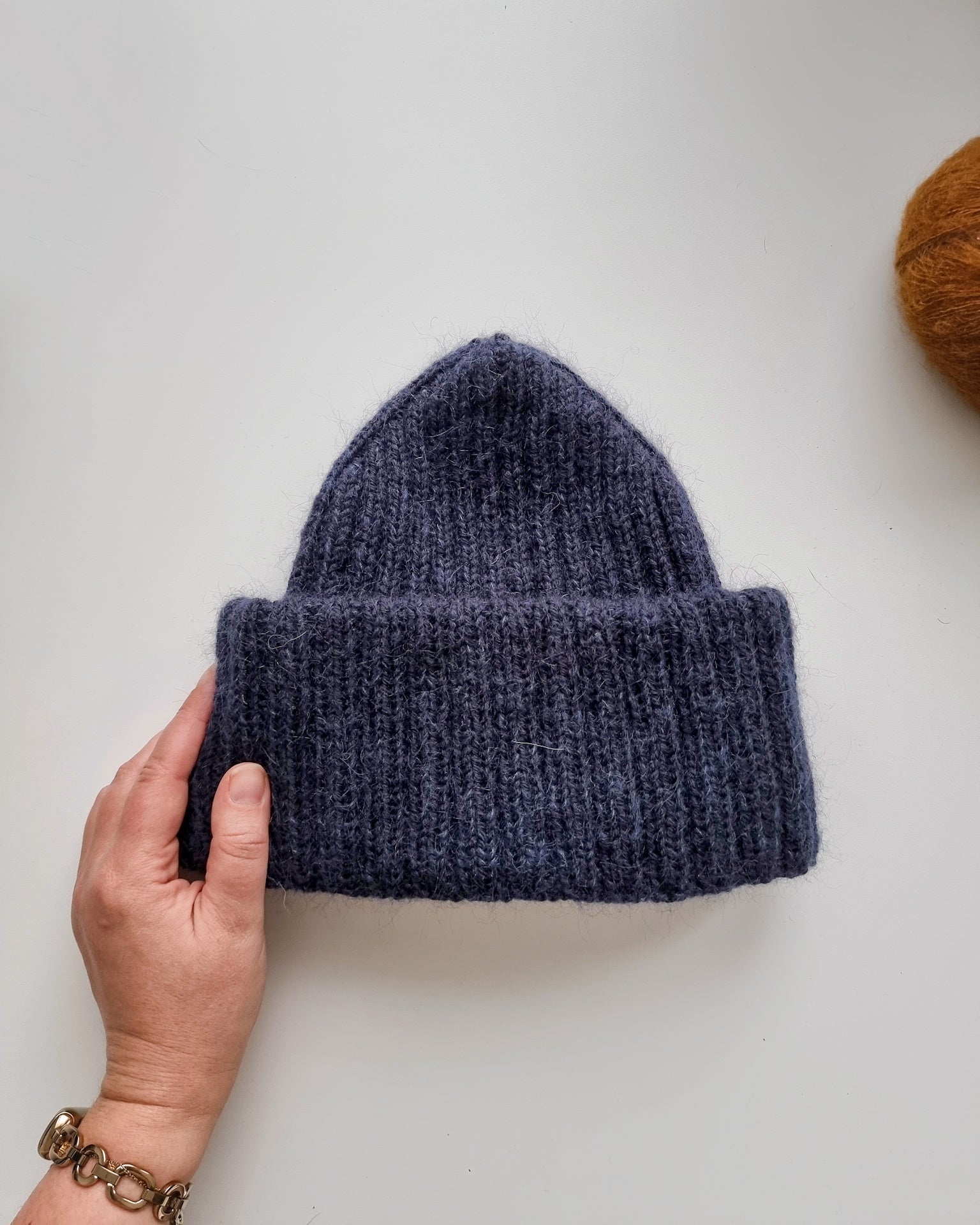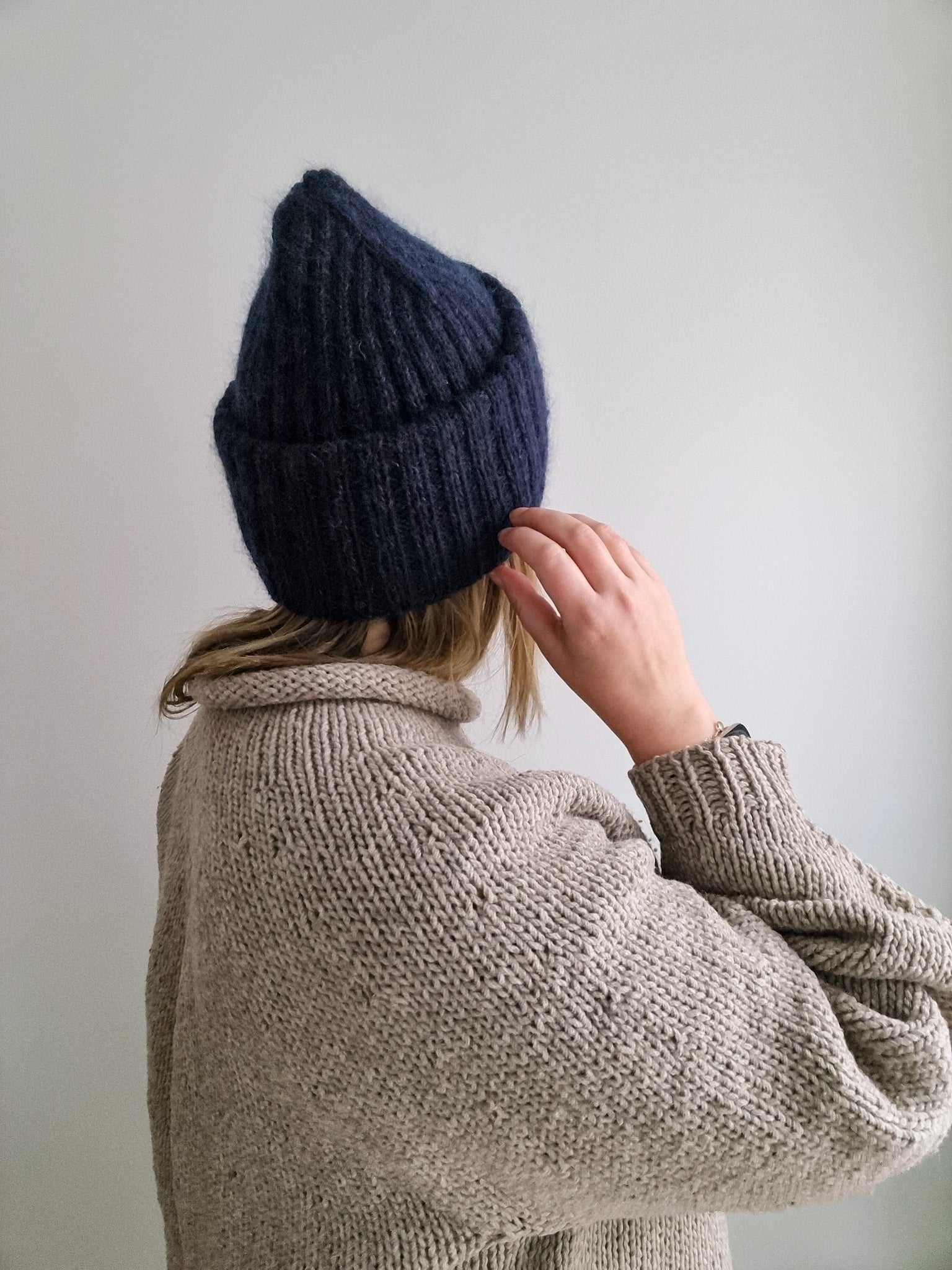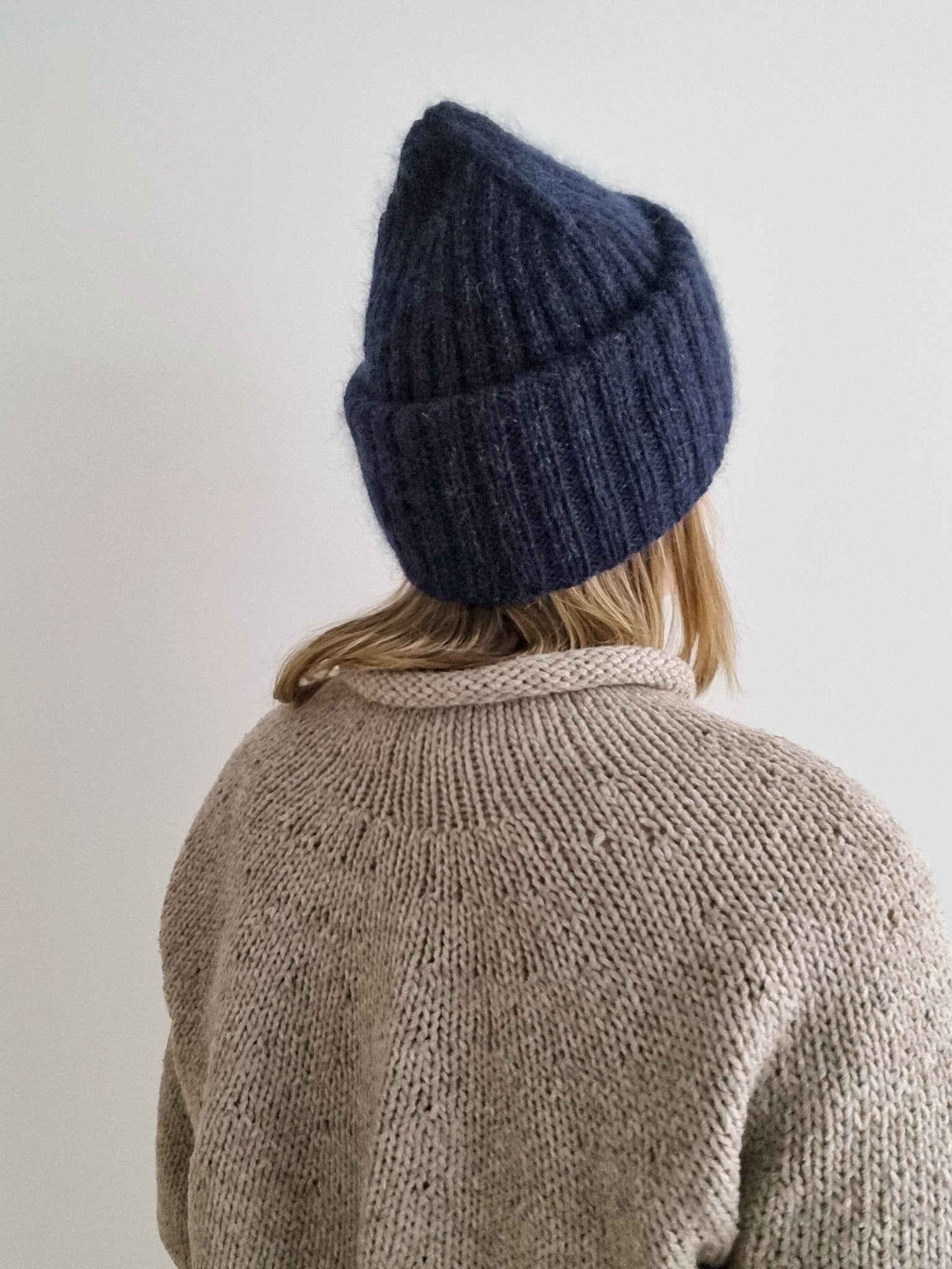 The Sailor beanie is knitted with two strands of yarn and the brim is folded twice for triple thickness around the ears bringing you extra warmth and coziness during the winter months. Combining a strand of silk-mohair knitted together with a DK weight merino yarn makes the hat really soft and gives it a beautiful halo.