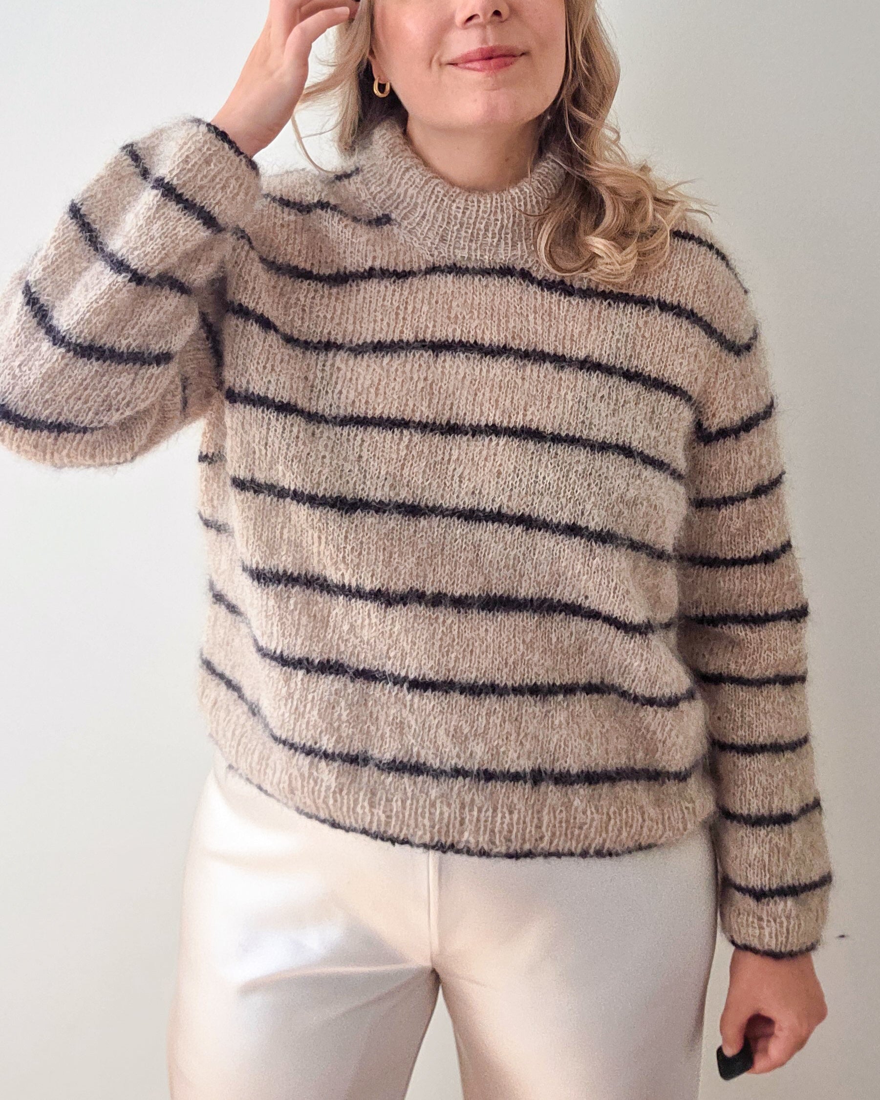 The Saltwind pullover can be worked in either a single strand of DK weight yarn or by holding one strand of fingering weight yarn together with a strand of silk mohair.