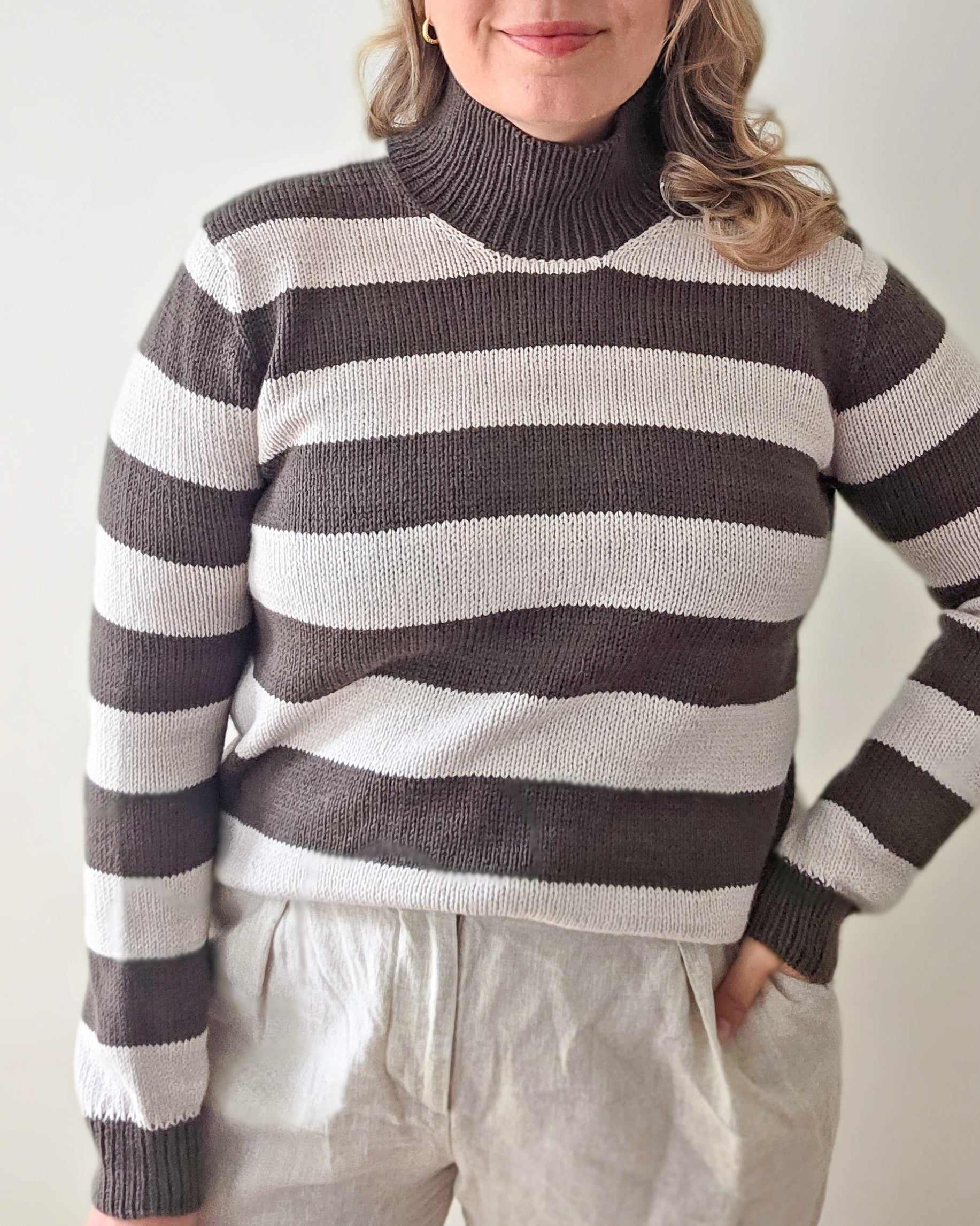 There are two options for the stripes: you can do a thick stripe version with 16-round stripes all over or alternate between thicker 14-round stripes and thinner 2-round stripes. There are also two options for the neck: you can fold the neck double, or leave it unfolded for a funnel neck.