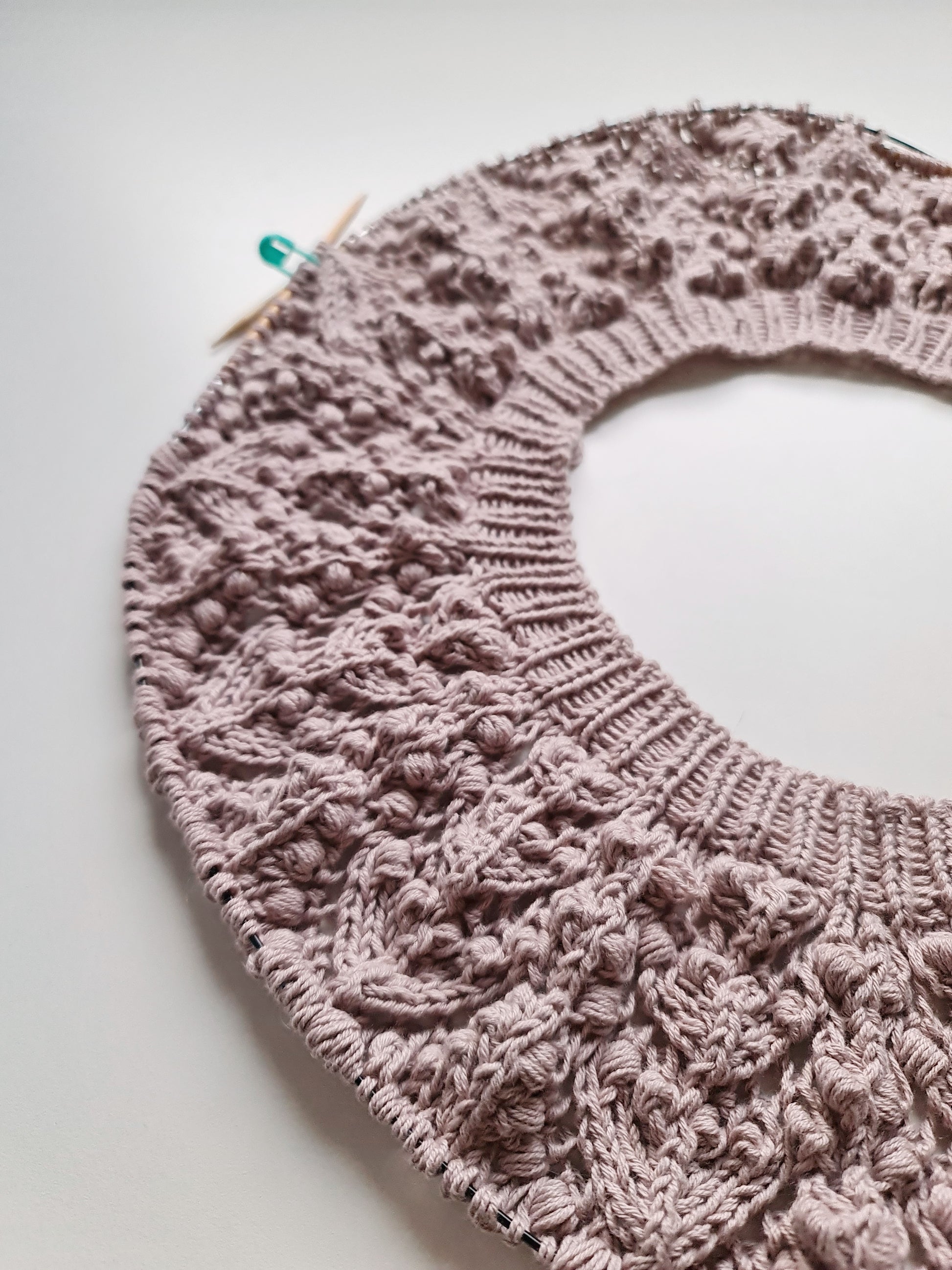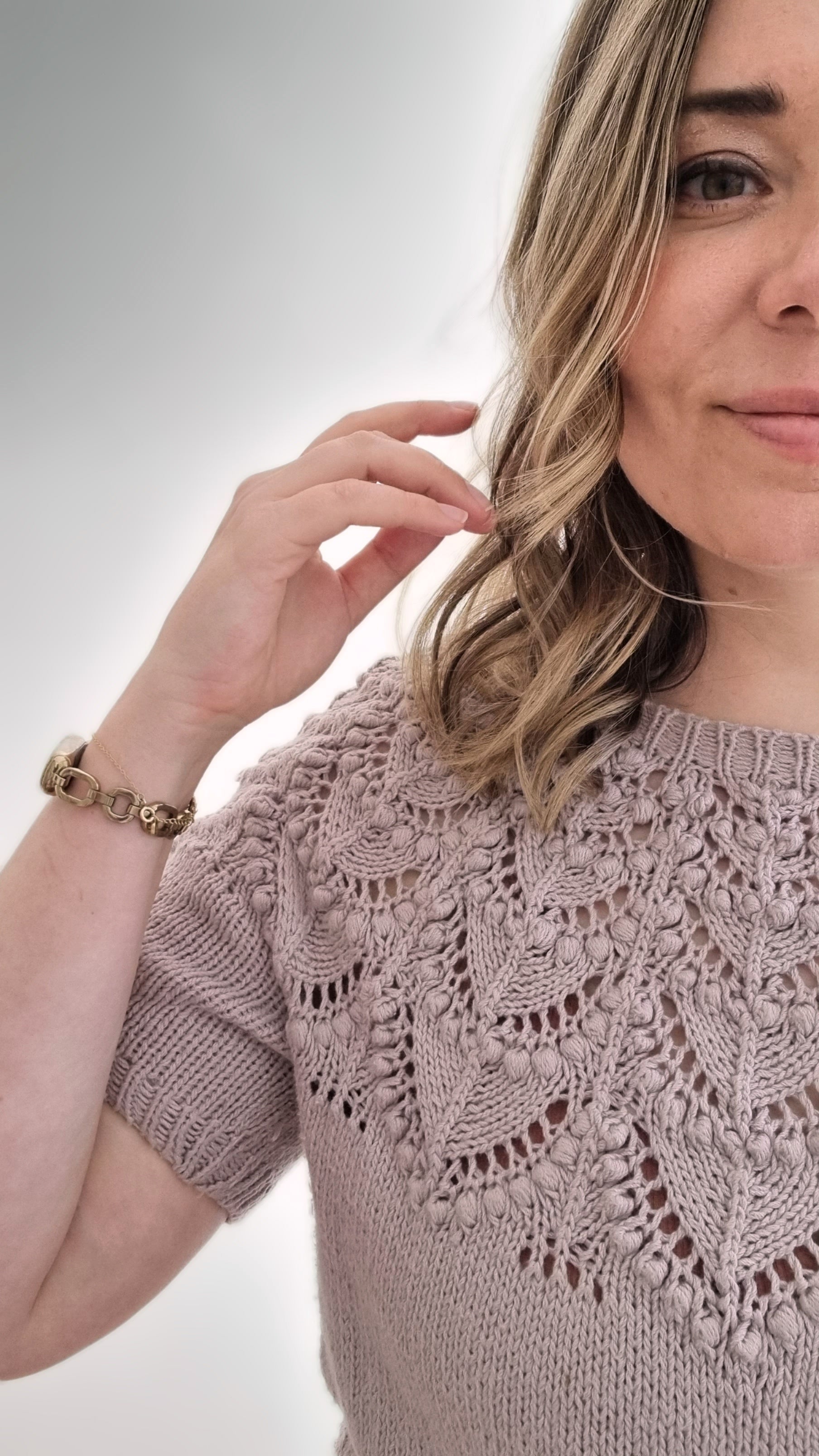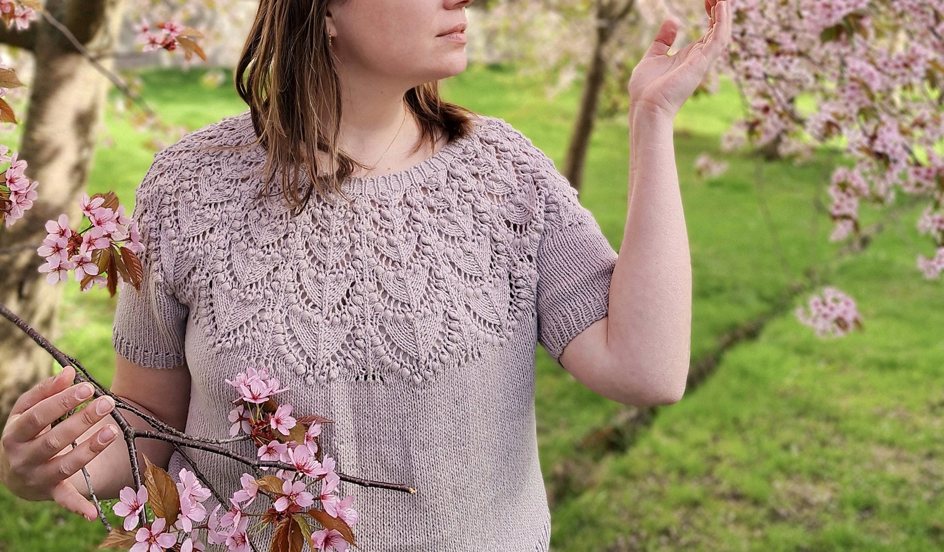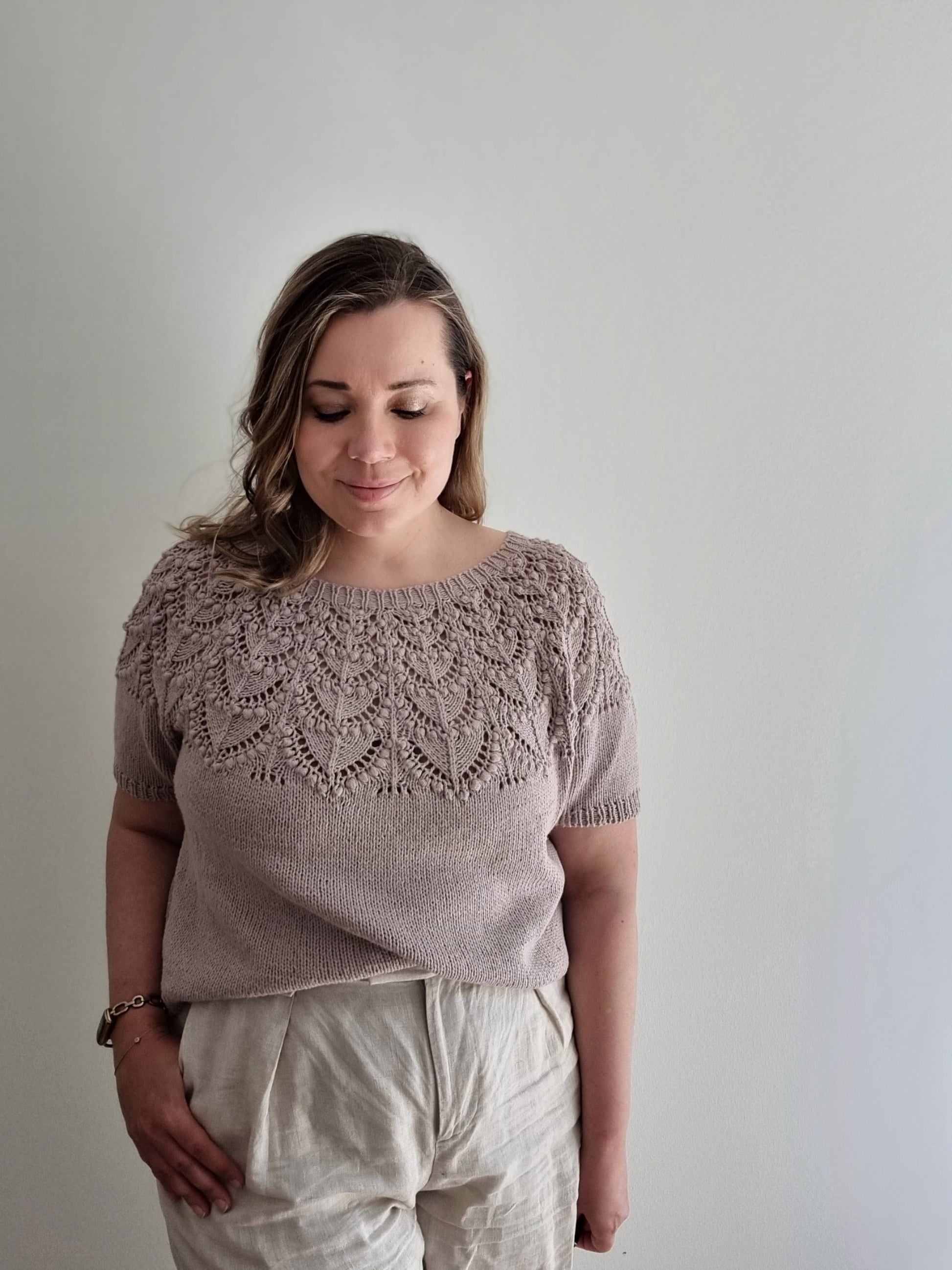 The Seleste tee is knitted seamlessly top-down starting at the neckband. The lace and bobble pattern is easy to memorize and the two-round bobbles are easy and quick to knit, without having to work any WS rounds. The sleeves and body are separated at underarm and knitted separately.