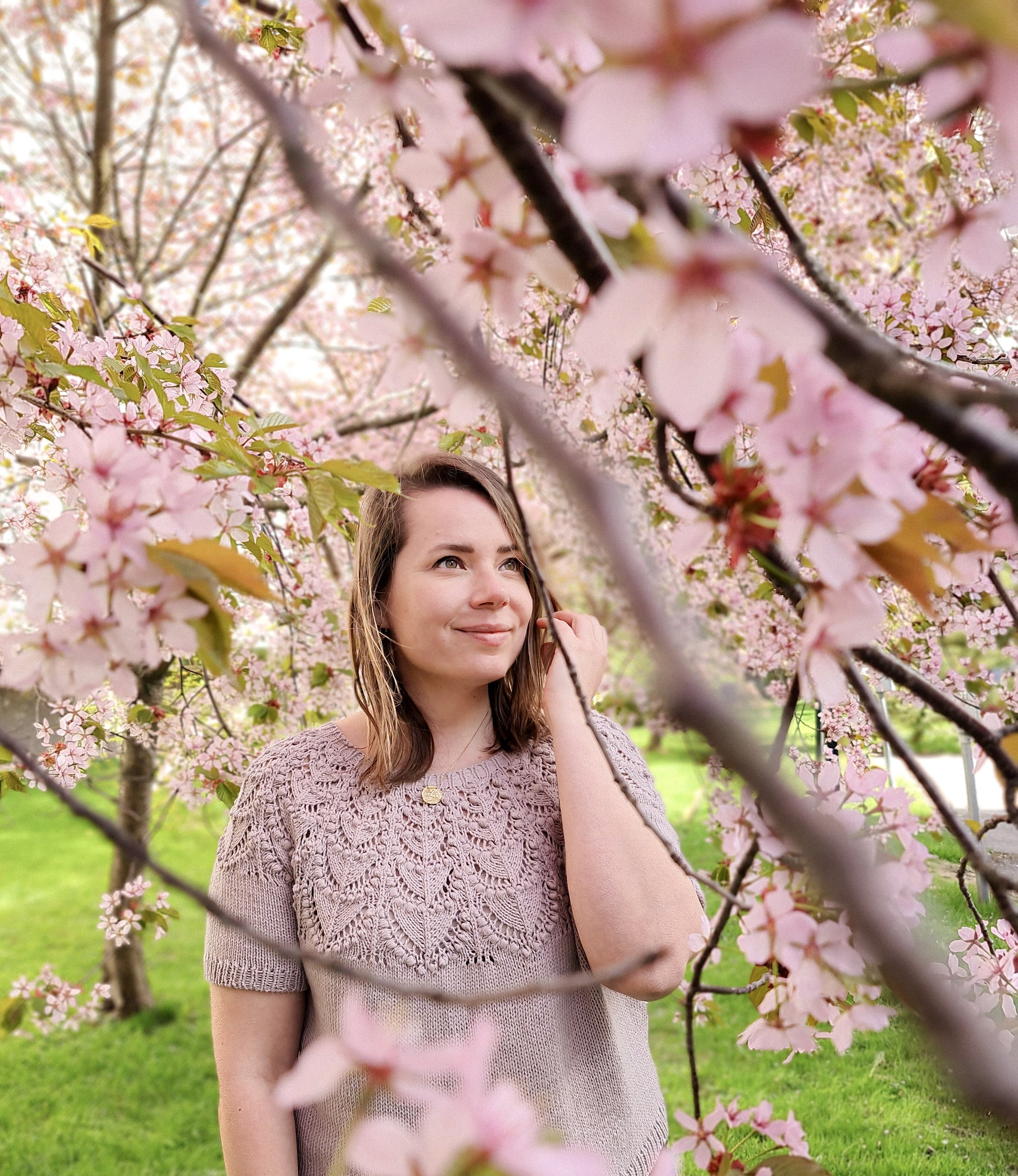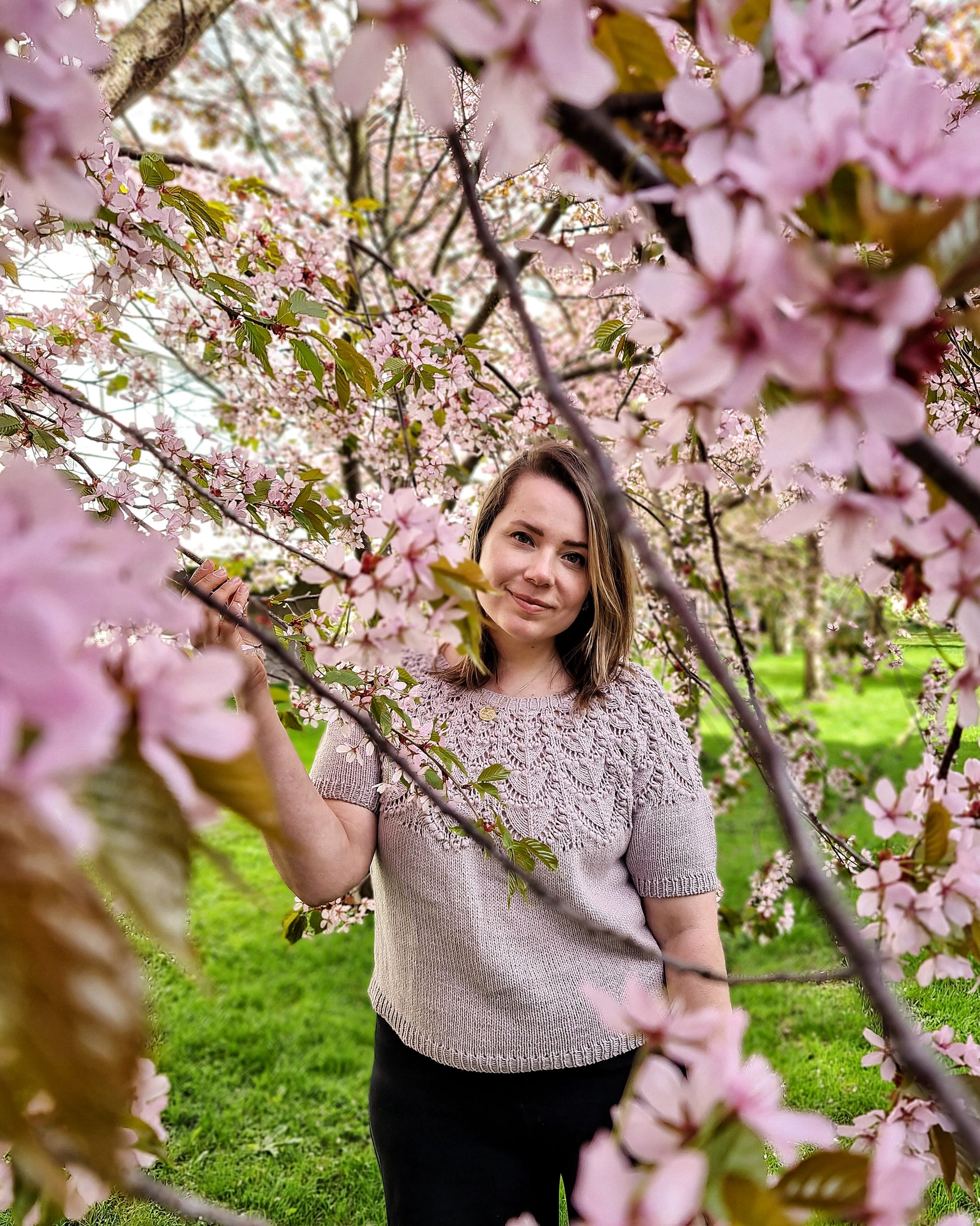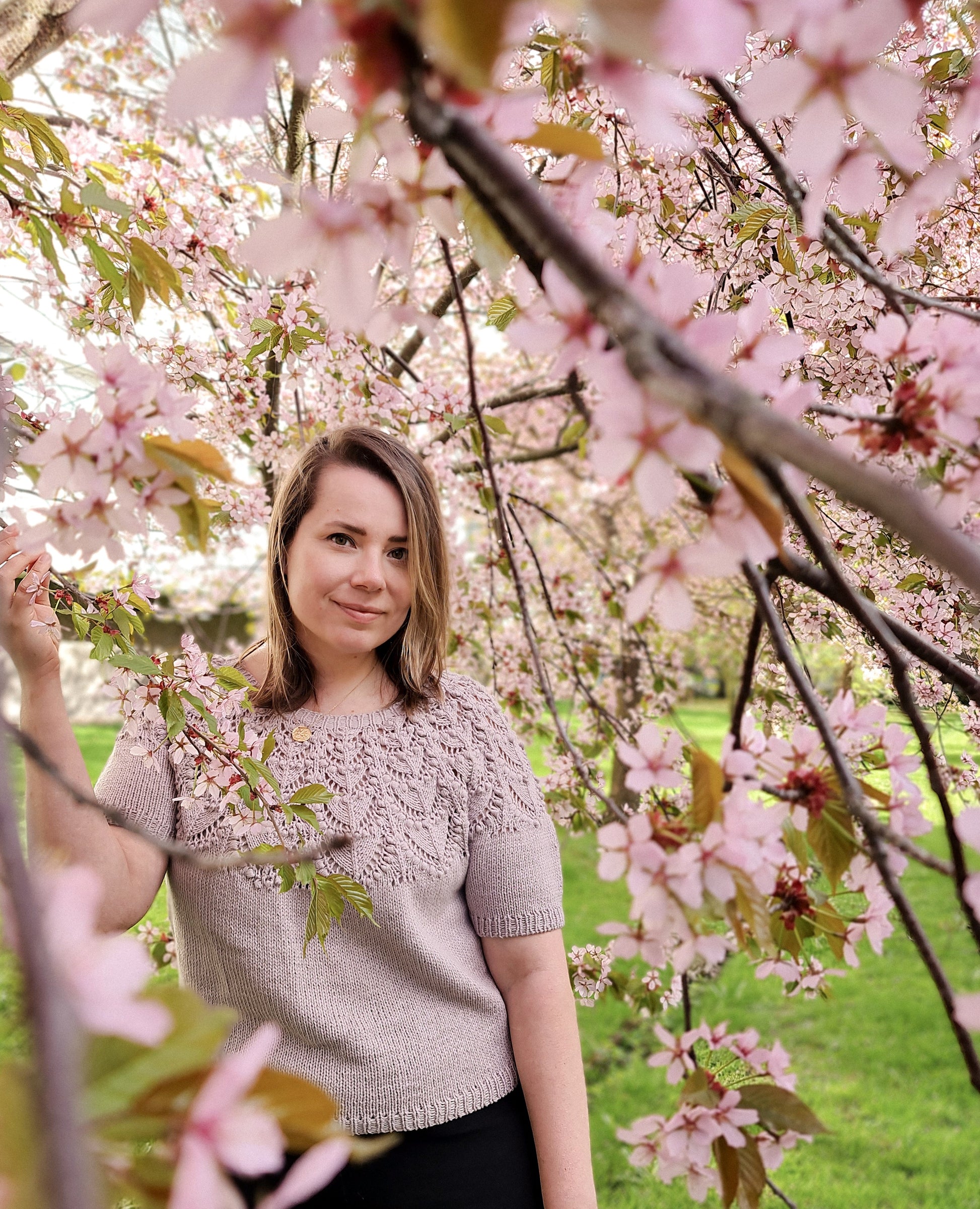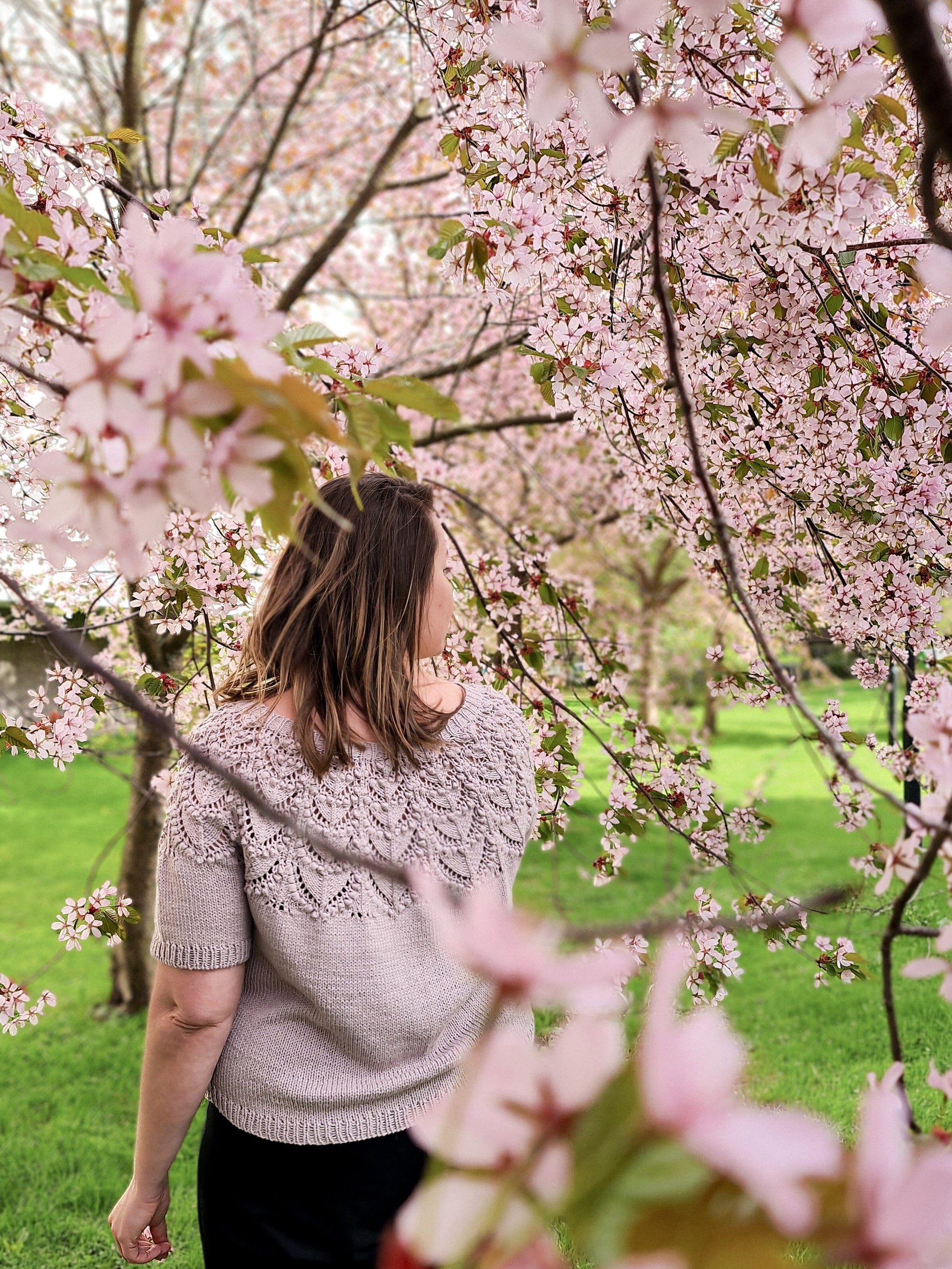 The Seleste tee is knitted seamlessly top-down starting at the neckband. The lace and bobble pattern is easy to memorize and the two-round bobbles are easy and quick to knit, without having to work any WS rounds. The sleeves and body are separated at underarm and knitted separately.