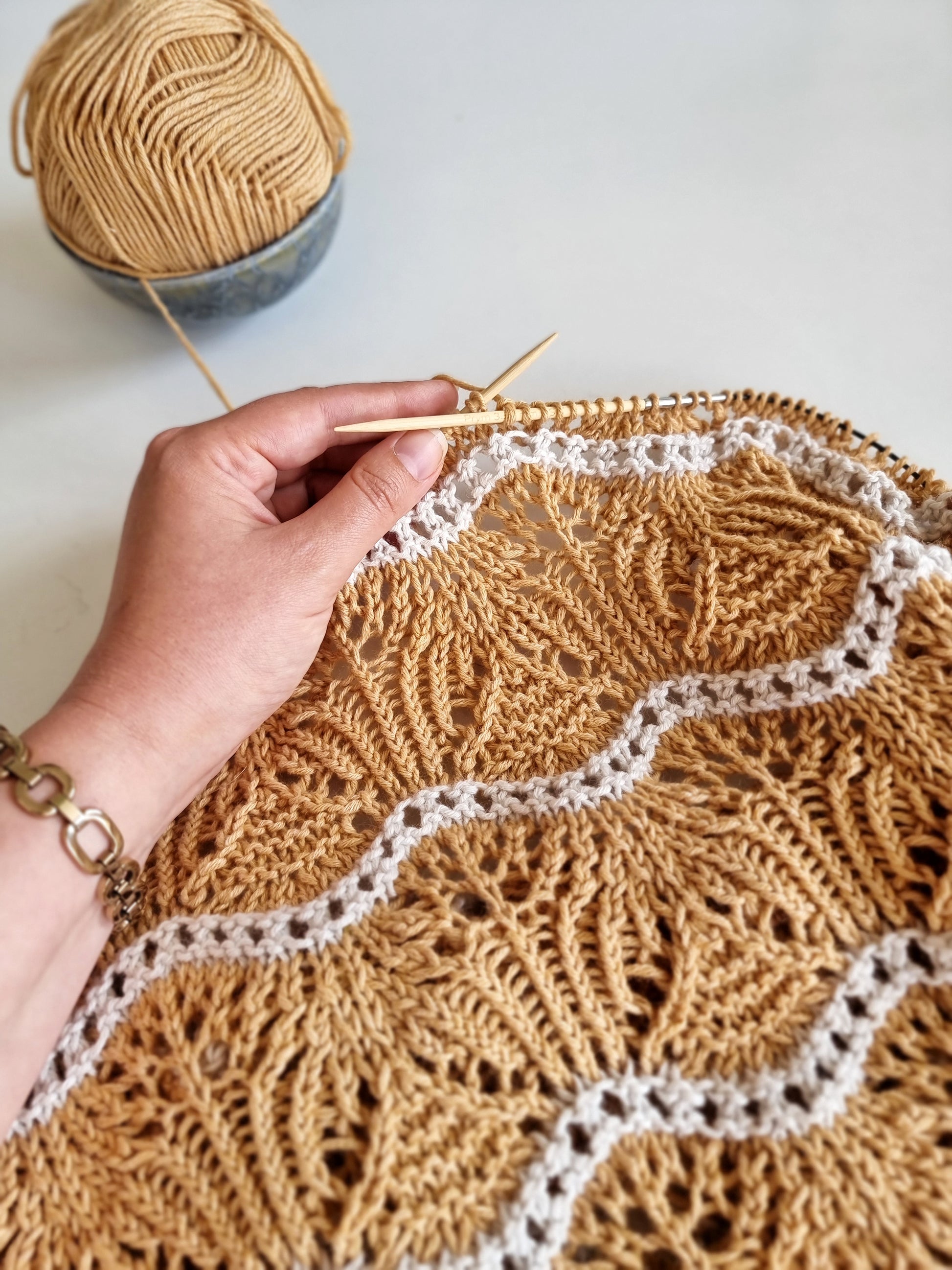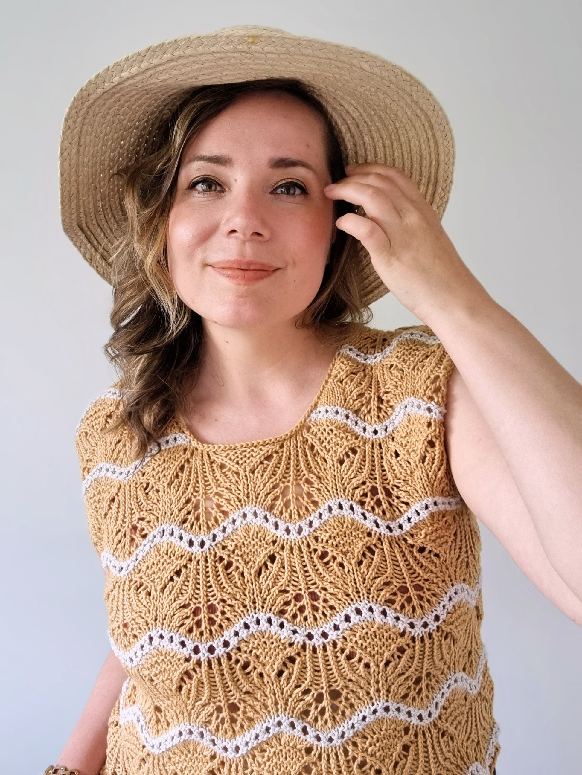 The Storsand top is knitted seamlessly from the top down with wavy lace patterns. The back and front are knitted flat down to the armholes. Then the pieces are joined and the body is knitted in the round. Lastly, stitches for the neckband and the sleeve edgings are picked up and worked in the round. All techniques are explained in the pattern. The lace patterns are charted only.