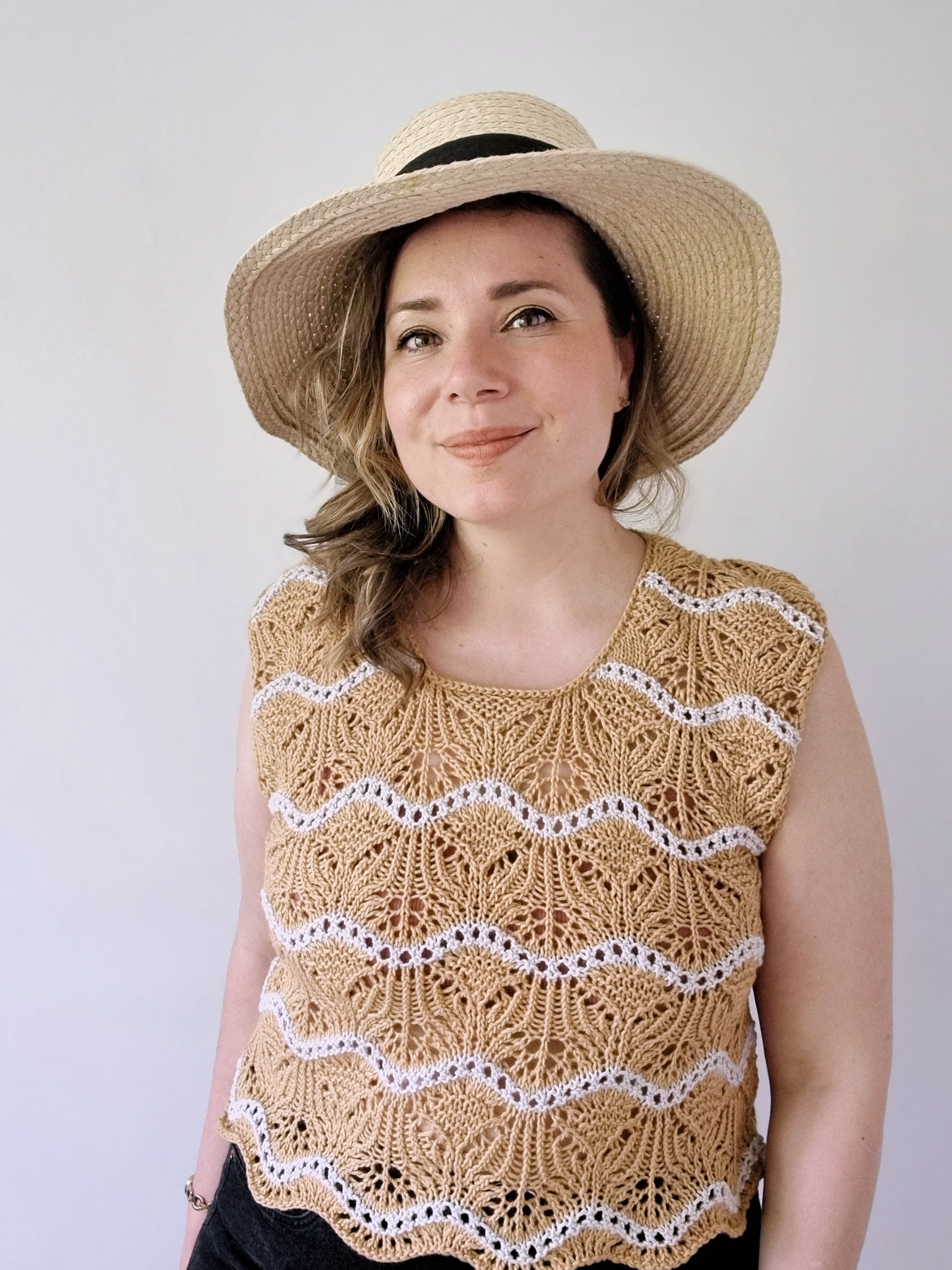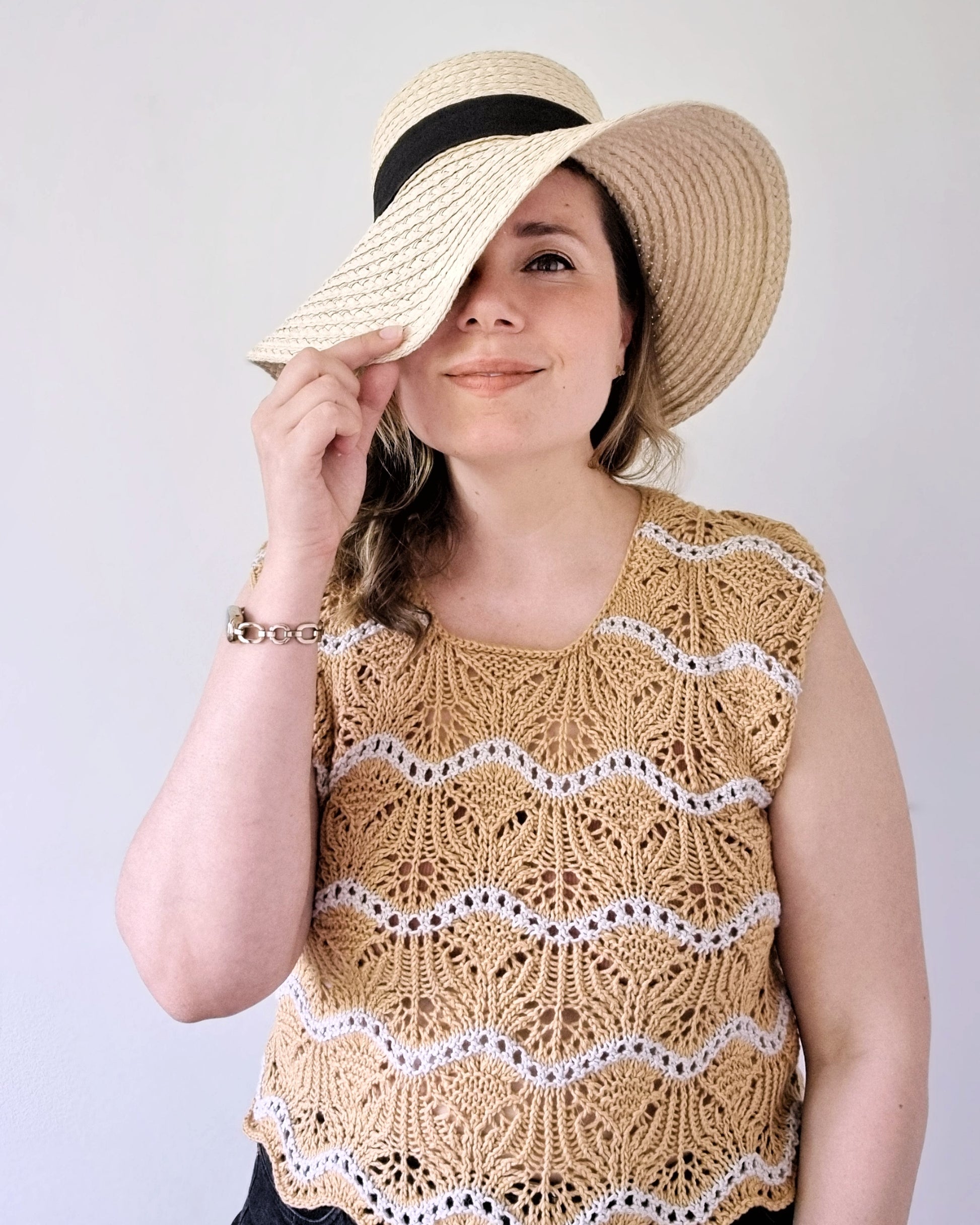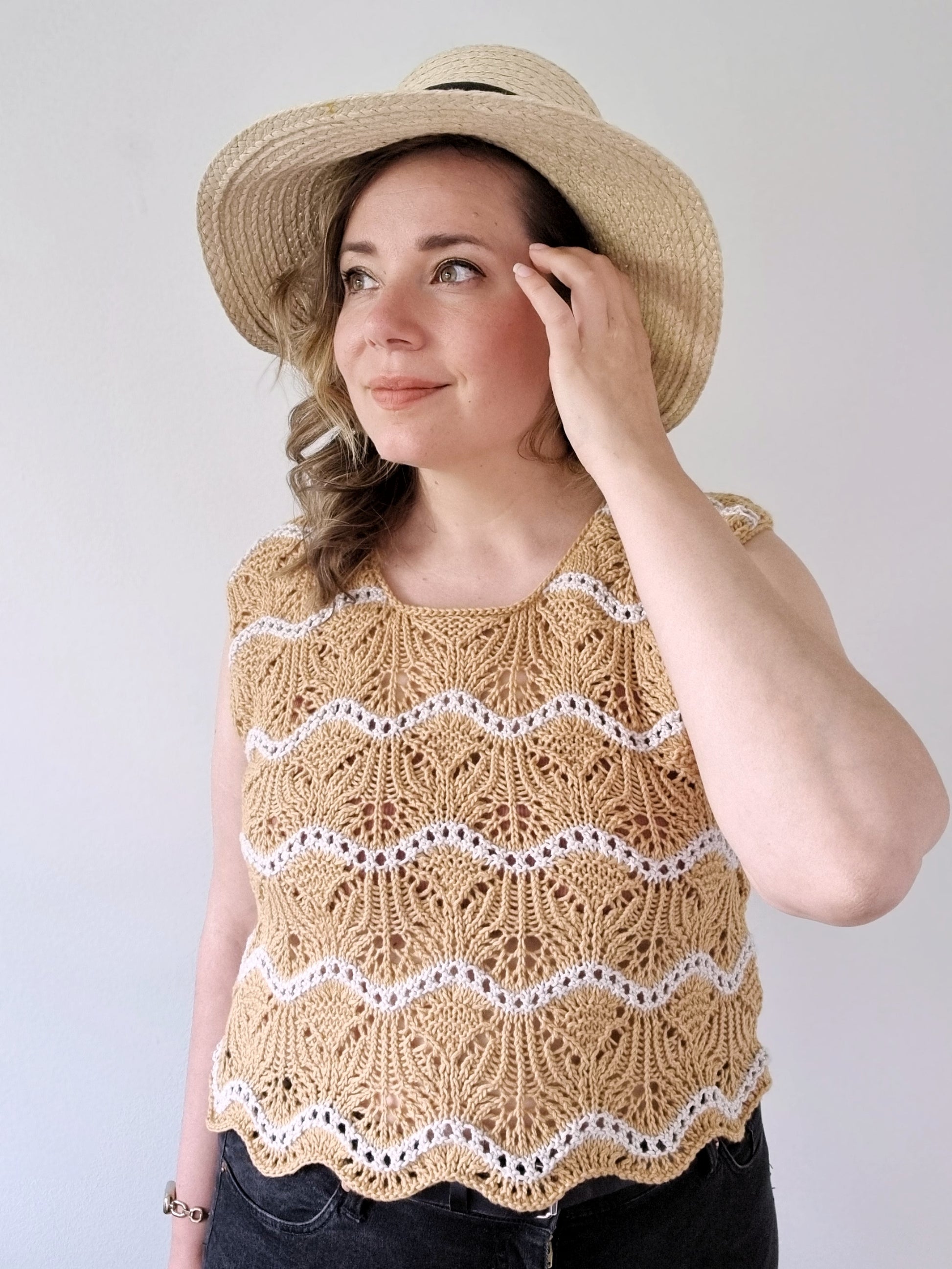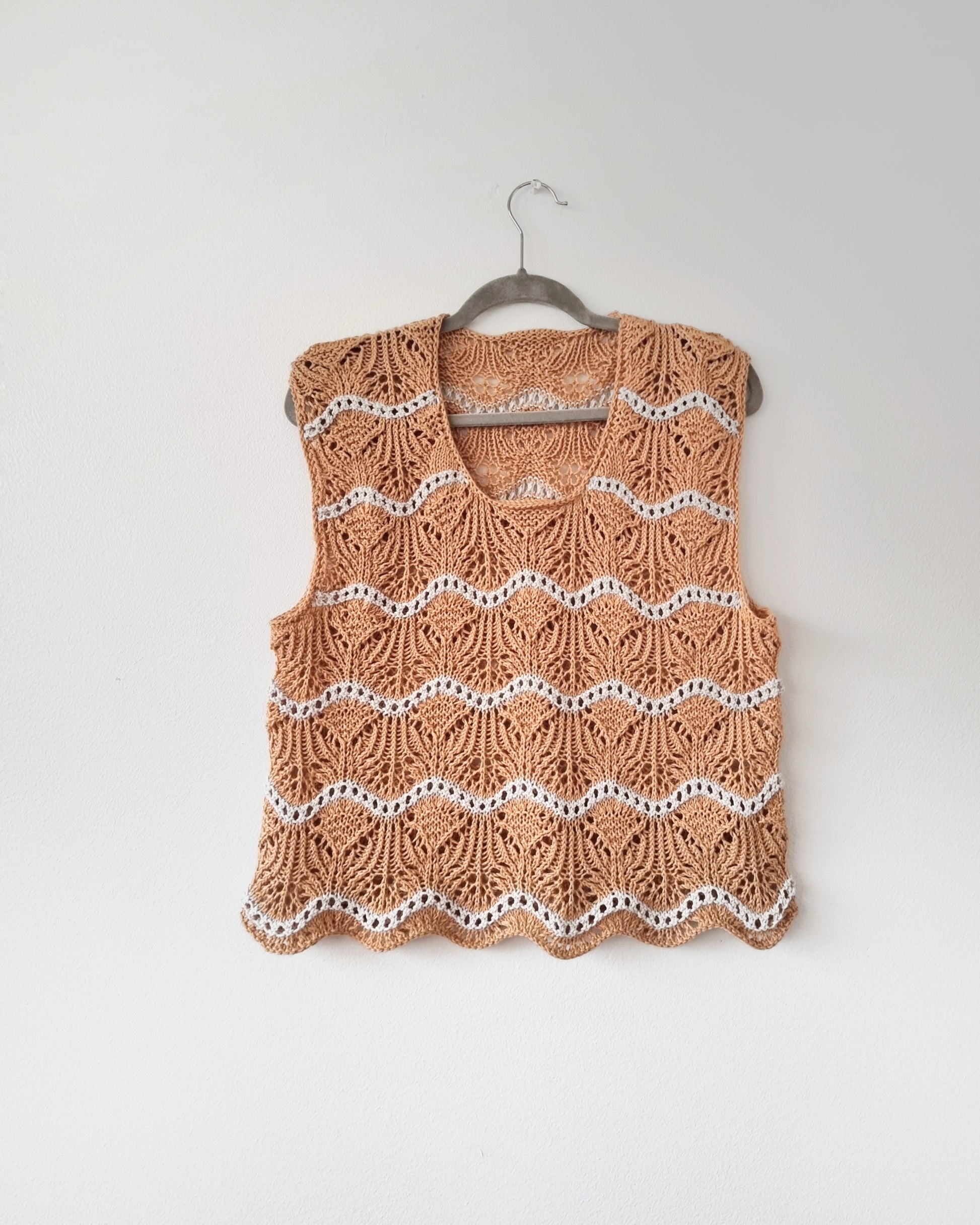 The Storsand top can be worn either as a sleeveless summer top or a vest. For a summer version I would recommend a cotton, viscose or linen blend. For a warmer, wintery version choose yarn with high wool content.