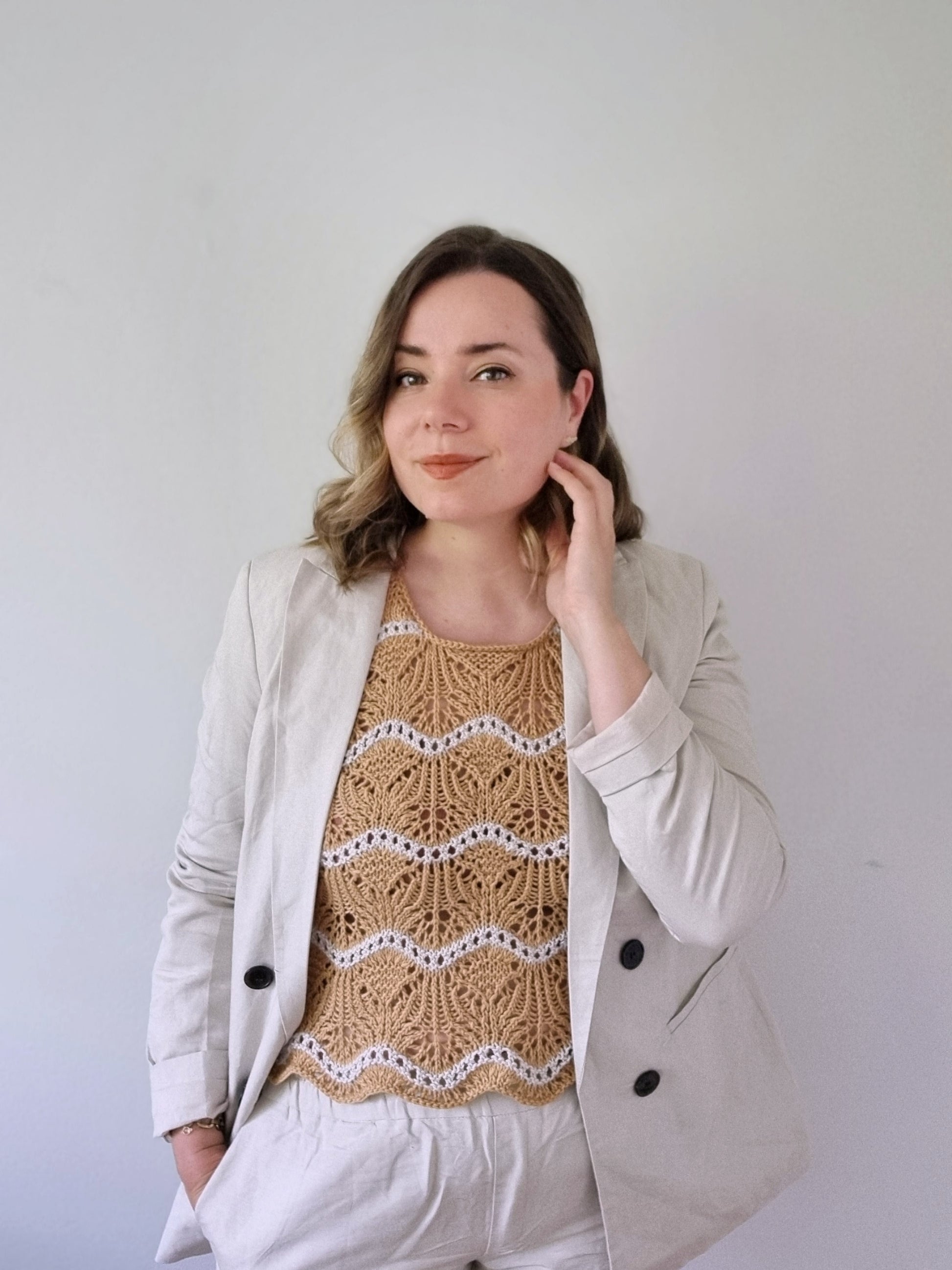 Storsand means “the big sand”. The Storsand top was named after a beach in my childhood hometown. The two-color lace stripes of the top remind me of the patterns waves make when they hit the sandy beaches.