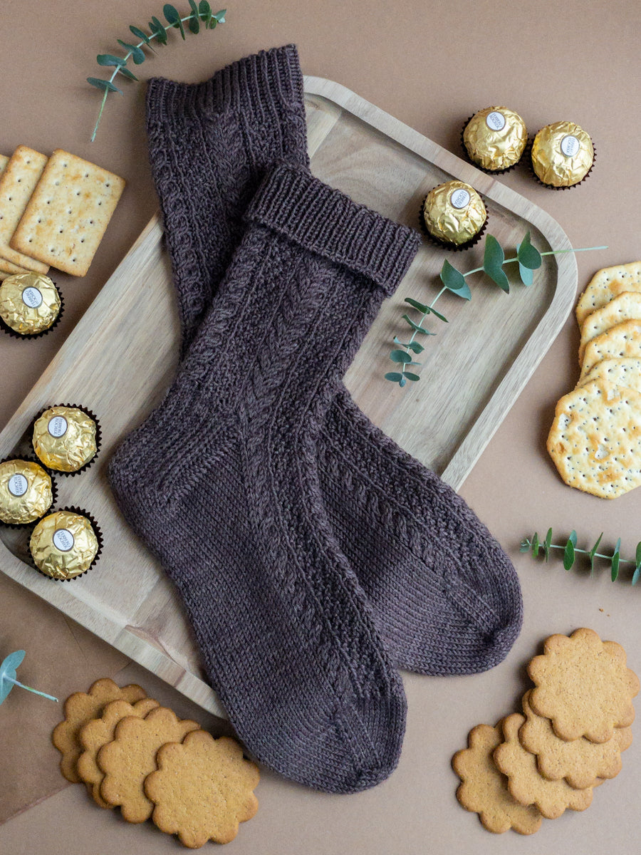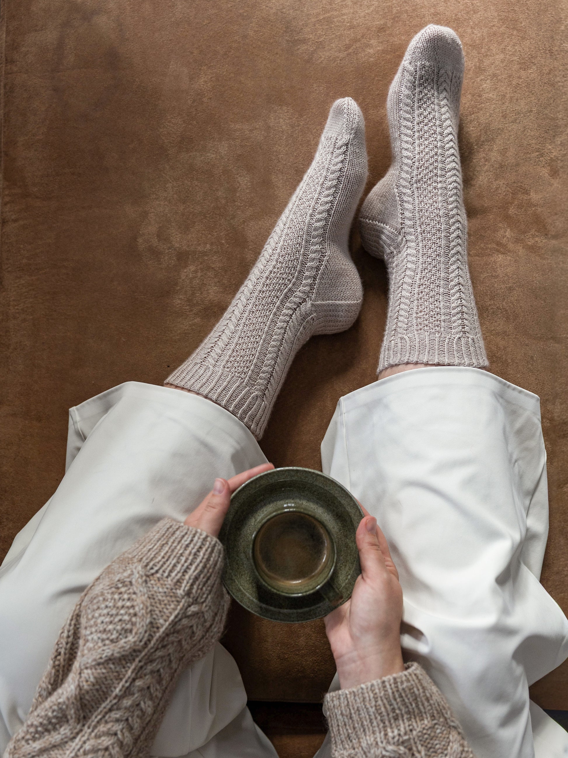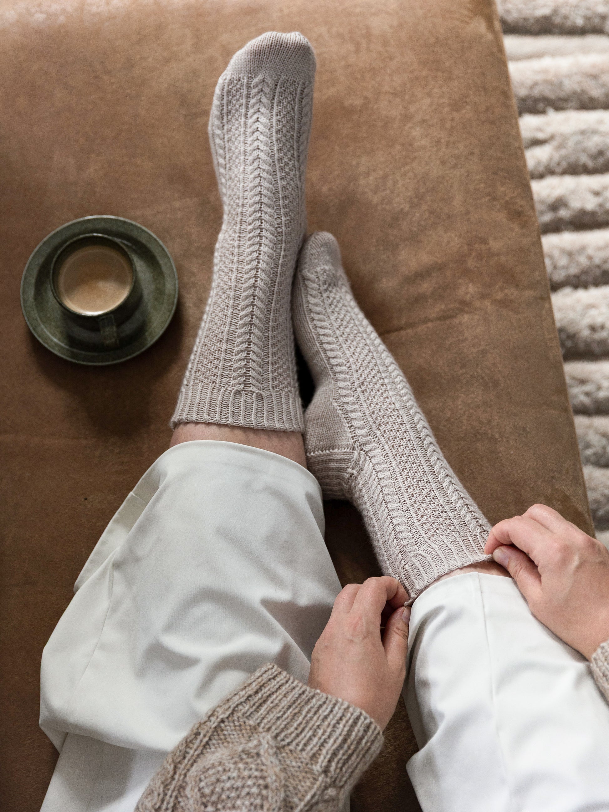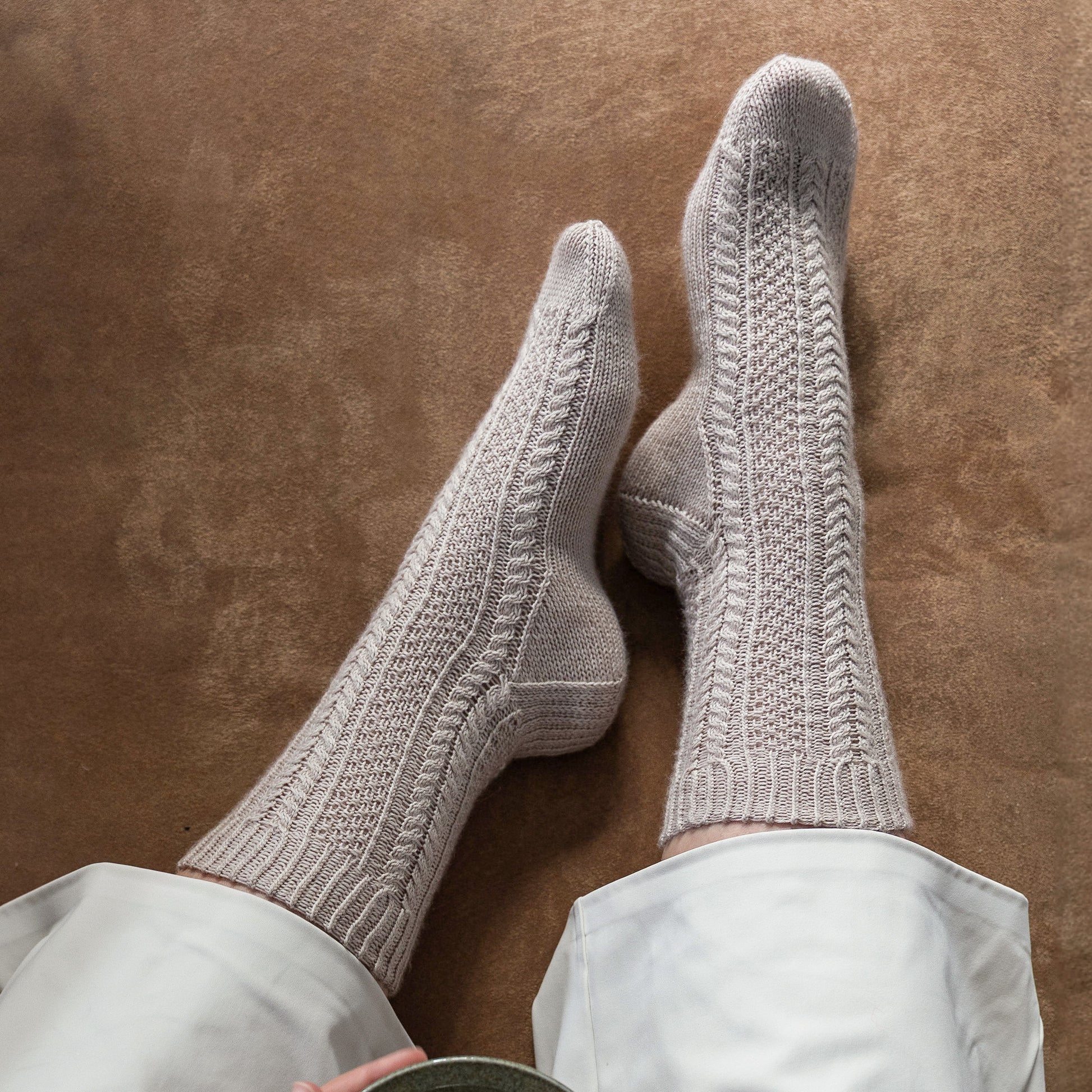The Sunday Stroll Socks are inspired by the relaxed rhythm of a quiet walk through cobblestone streets and winding alleys on a leisurely Sunday afternoon. Their allover cable and moss stitch pattern evokes the gentle texture of sunlit sidewalks and charming corners, bringing a touch of that calm, reflective pace to your everyday wardrobe.