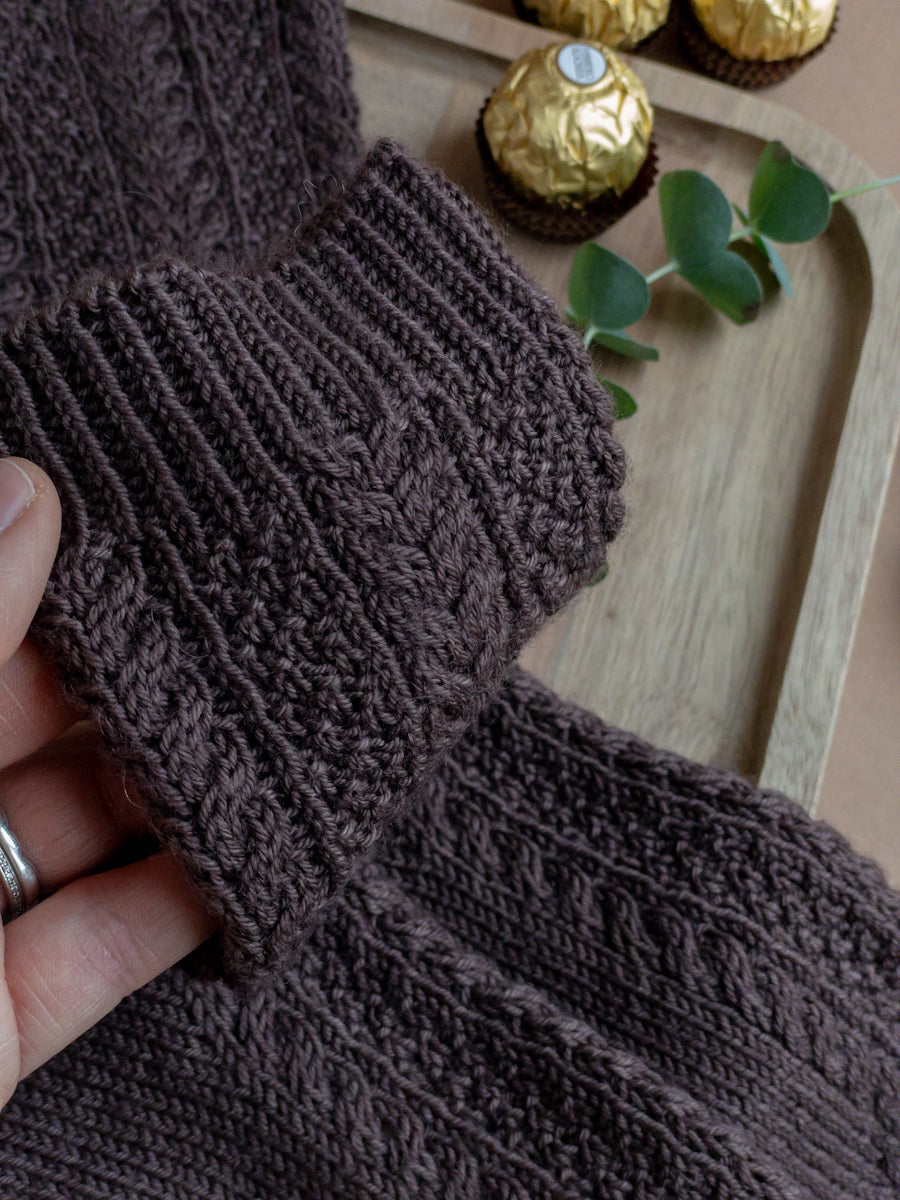 Knitted from the cuff down to the toes, the socks begin with an optional tubular cast-on for a neat, stretchy edge. The heel flaps are worked in a reinforced stitch pattern for durability, while round French heels provide a comfortable, classic fit. Instructions are included for adjusting the gusset if you’d like a slightly more generous fit, ensuring these socks are as cozy as they are elegant.
