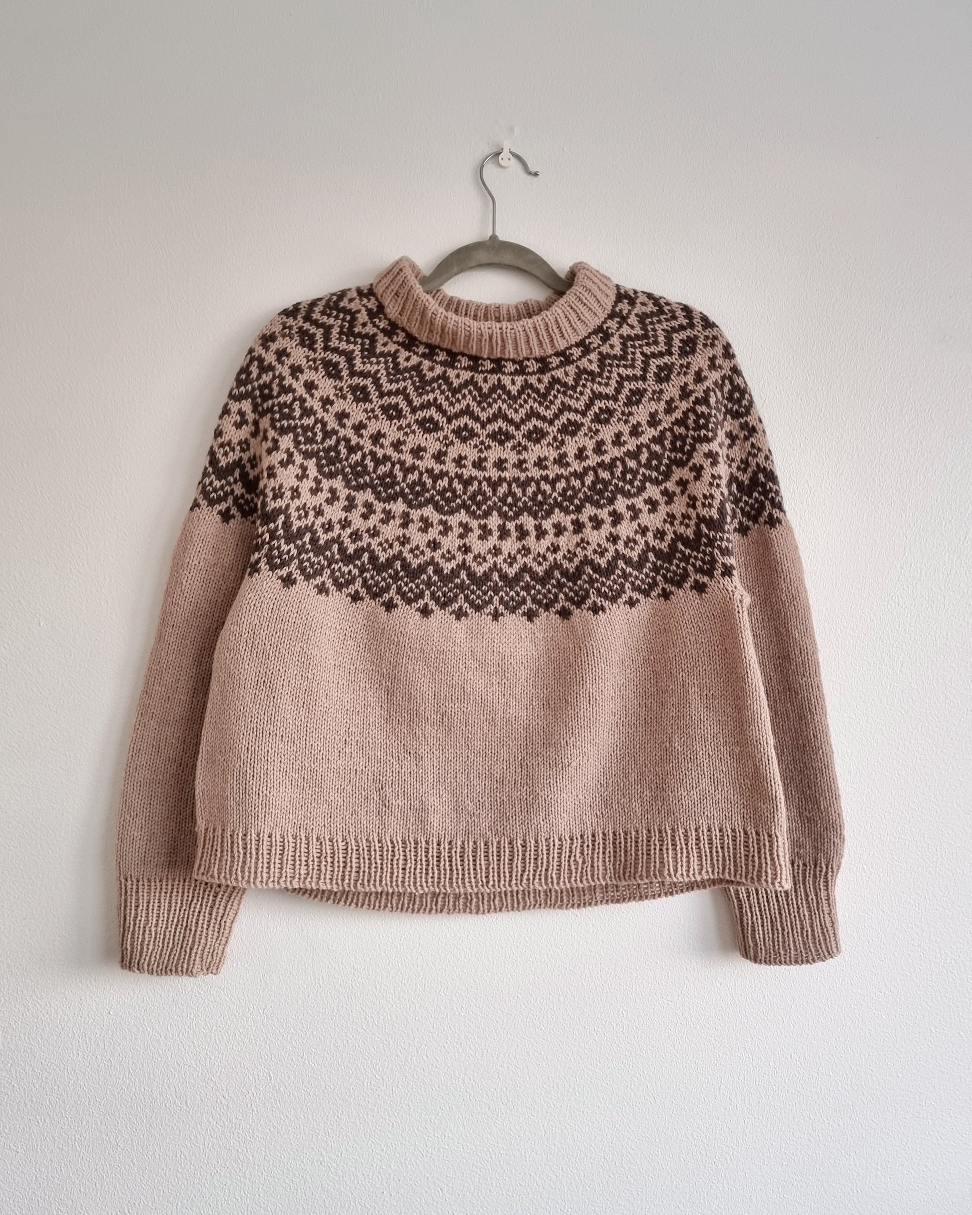 The Vargö pullover is knitted seamlessly top-down starting at the neckband. The yoke is knitted in stranded colorwork. The patterns are easy to knit with short pattern repeats (the maximum length of floats is 5 stitches on 3 rounds only). The sleeves and body are separated at the end of the circular yoke and knitted separately. The back is shaped with optional short-rows to improve the fit. Choose two colors with high contrast (one dark color, one light) for the patterns to show.