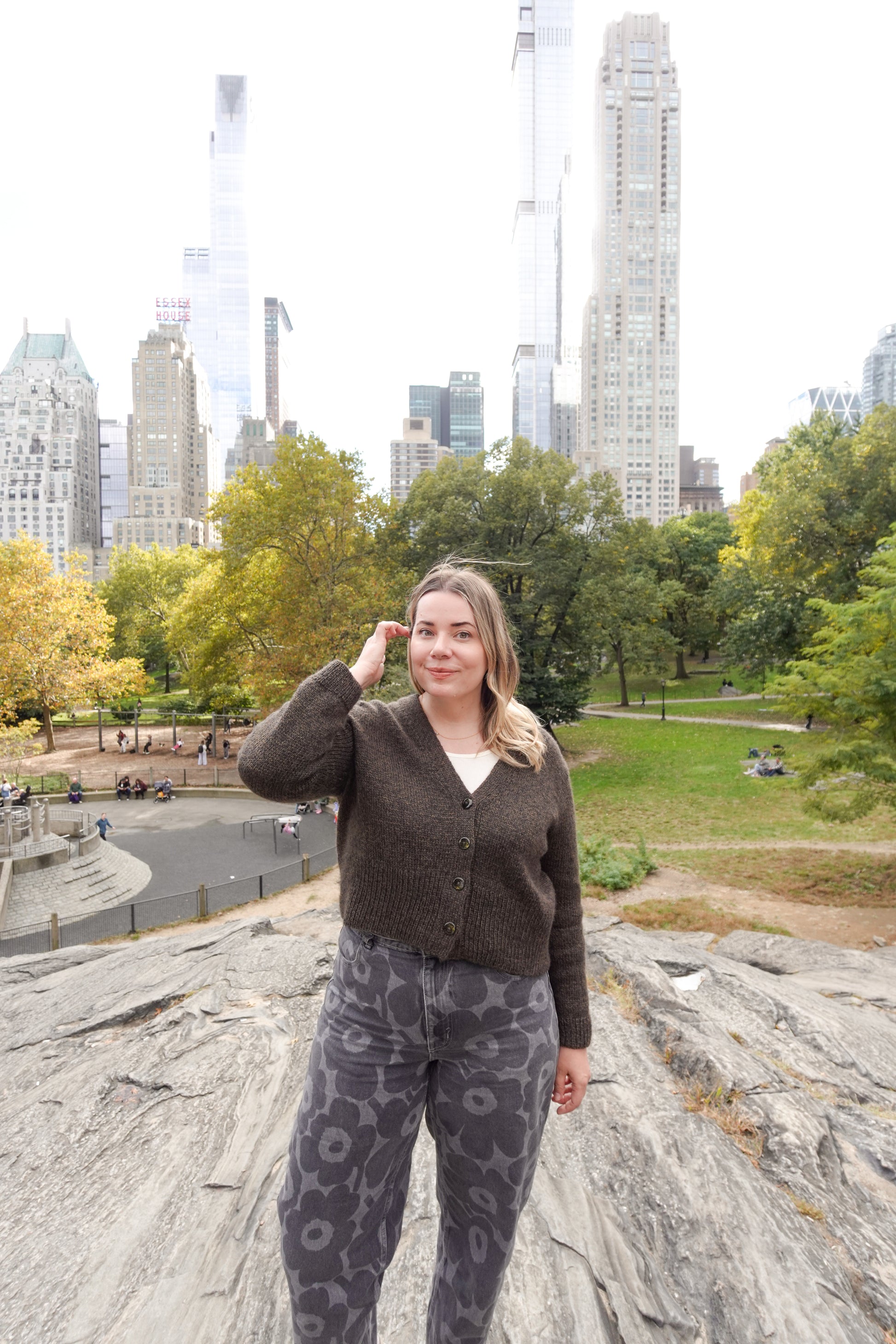 The cardigan is worked seamlessly from the top down. It begins at the back neck, which is increased to the full width of the upper back before stitches are picked up for the shoulders and worked as the fronts. The yoke is knitted flat with increases for both sleeves and body, creating a comfortable fit through the shoulders. The body is left open at the front, framed by the double-knit button bands for a clean, finished edge. At the underarms, sleeves and body are separated and completed individually, the body flat and the sleeves in the round.