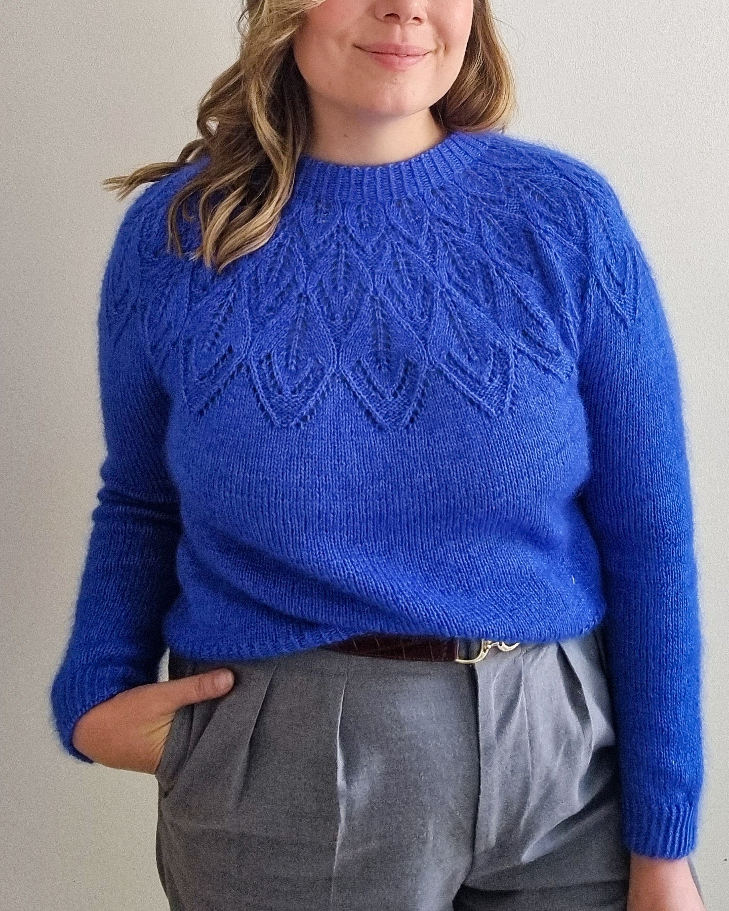 The Wood Anemone pullover is knitted seamlessly top-down starting at the neckband. A beautiful lace pattern is worked on the yoke (with optional bobbles that you can leave out if bobbles aren’t your thing). The sleeves and body are separated at the underarm and knitted separately. The back is shaped with short-rows to give it a bit more length and to improve the fit. The body is slightly cropped so it’s perfect to pair with a dress, a skirt or a pair of high waisted pants, but the length is easily modified for a longer fit. Note that changing the length of the body will affect the amount of yarn needed to finish the pullover, so if you want a longer body, make sure you get a few extra balls of yarn.